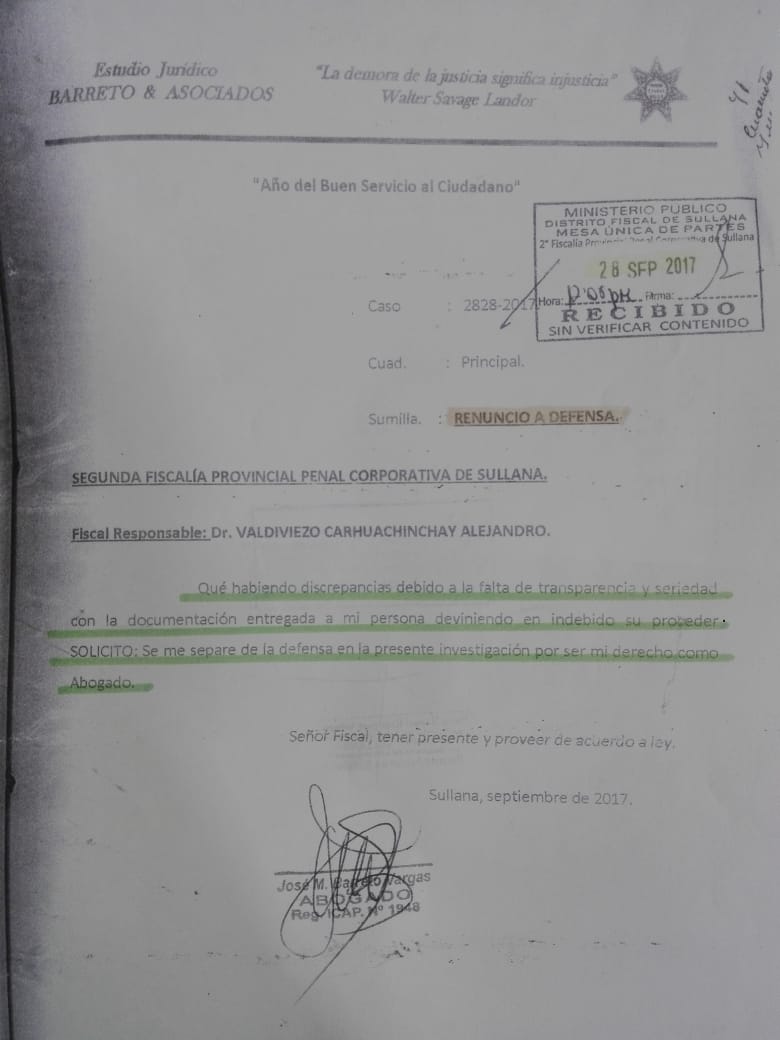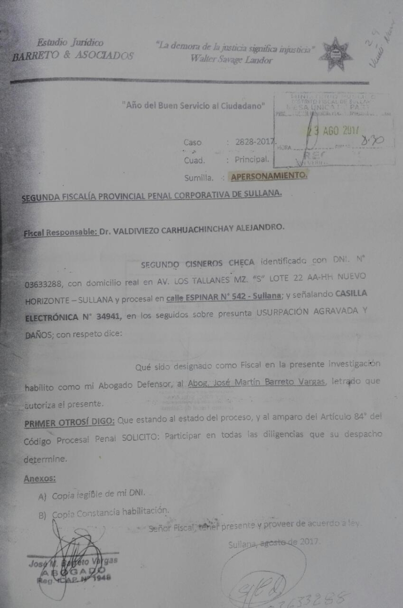 “En los documentos se indica que, desde el 23 de agosto que contratan mis servicios, yo solo he participado en ciertas diligencias. Como pasaban los días y no me no me pagaban los honorarios, ellos me ofrecieron que cuando recuperaran las tierras las iban a vender y ahí me pagarían el 4%. Antes del 28 de setiembre les pido una documentación, cuando llegan con los documentos me doy cuenta que estos eran falsos. Le increpo esto al señor Cisneros y al no obtener una respuesta, el 28 de setiembre renuncio como abogado”.