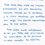 “Desde donde estoy, siento una inmensa preocupación por este dramático momento causado por la pandemia y la crisis económica que constituyen una carga muy pesada especialmente para los más pobres”, redactó Fujimori Fujimori.