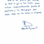 El exmandatario Alberto Fujimori se ha manifestado a través de una carta desde el penal de Barbadillo, en la sede de DIROES. Fujimori Fujimori usó la misiva para hablar de la pandemia por COVID-19 y la crisis económica que esta ha causado en el Perú.