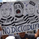 Hombre muestra pancarta con caricaturas de Maduro y otras autoridades. Foto: AFP.