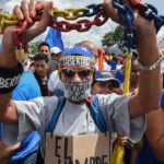 Hombre marcha con cartel pidiendo se acabe el hambre que a diario padecen él y sus compatriotas. Foto: AFP.