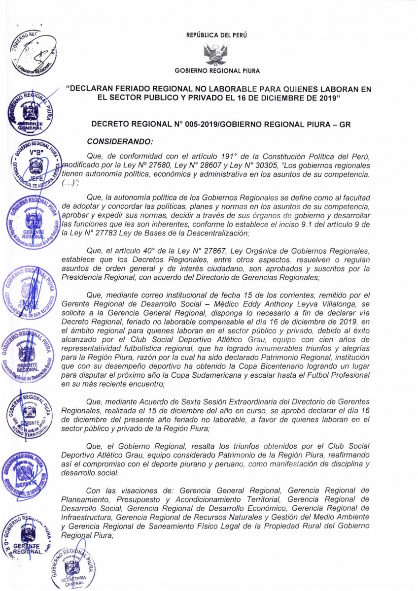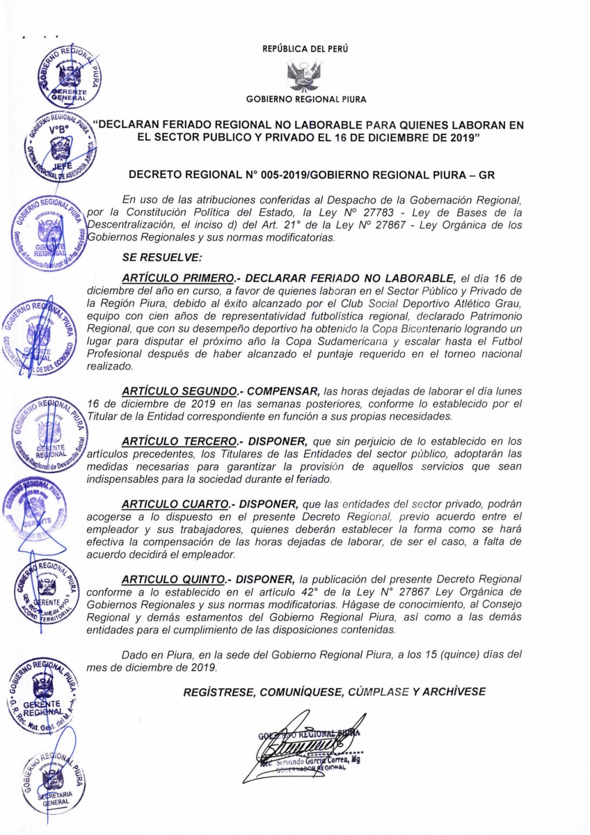 El Gobierno Regional de Piura declaró este lunes 16 de diciembre «feriado no laborable compensable» para trabajadores del sector público y privado de la región, debido al éxito del Club Atlético Grau que, el último sábado, ascendió al Primera División.