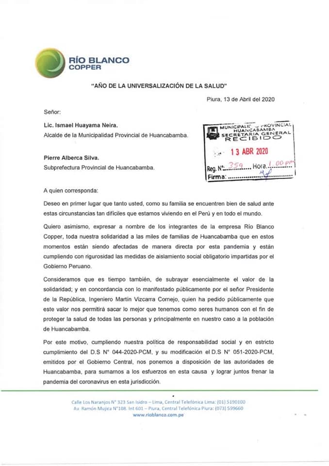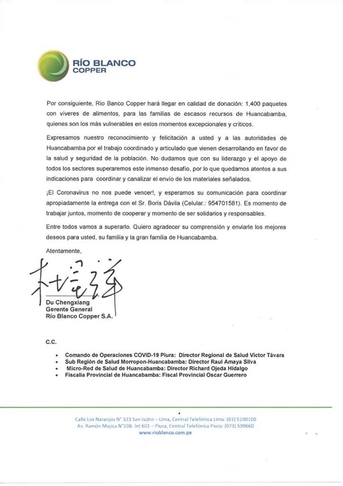 El pasado 13 de abril, la minera Río Blanco envió, a la comuna de Huancabamba, un oficio en el que mostraba su intención de donar mil cuatrocientos paquetes de víveres, que serían destinados a las familias más vulnerables de la zona.