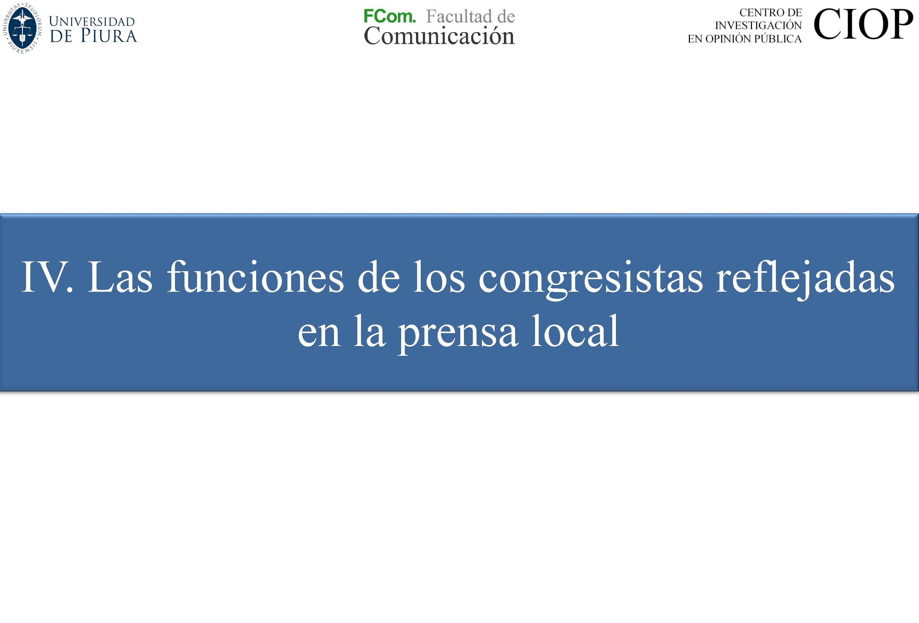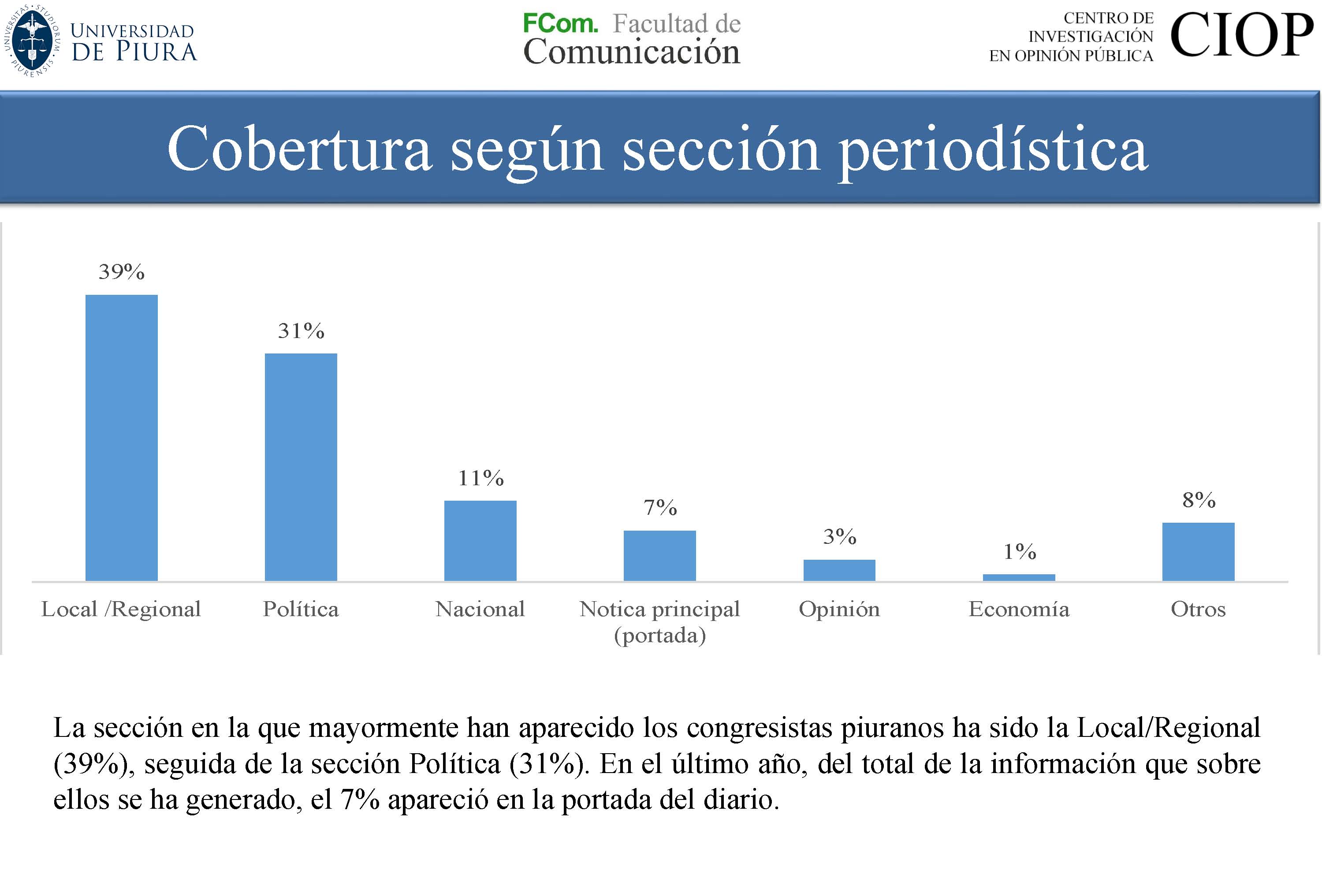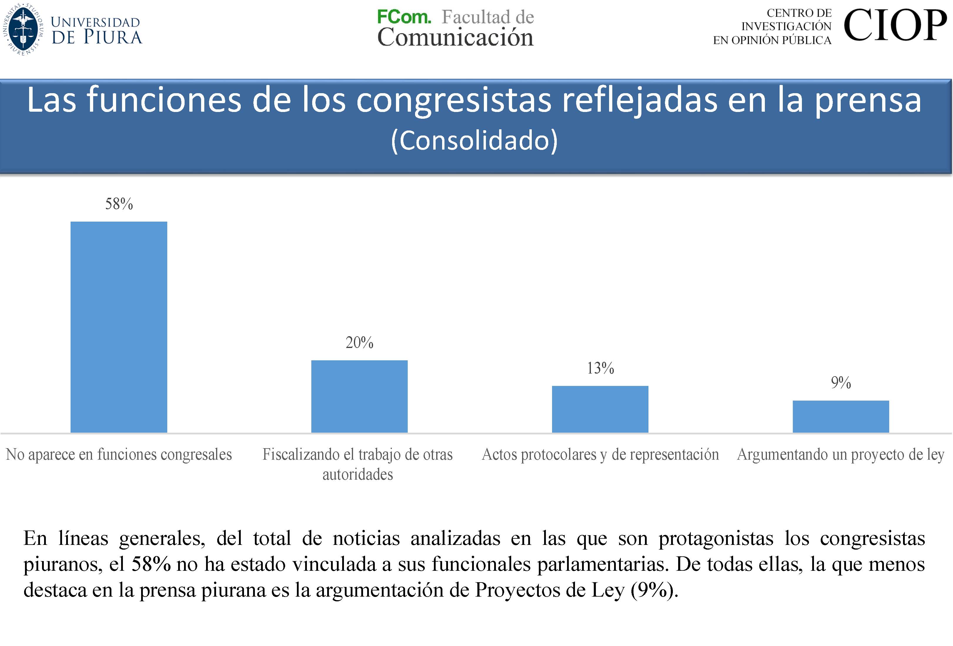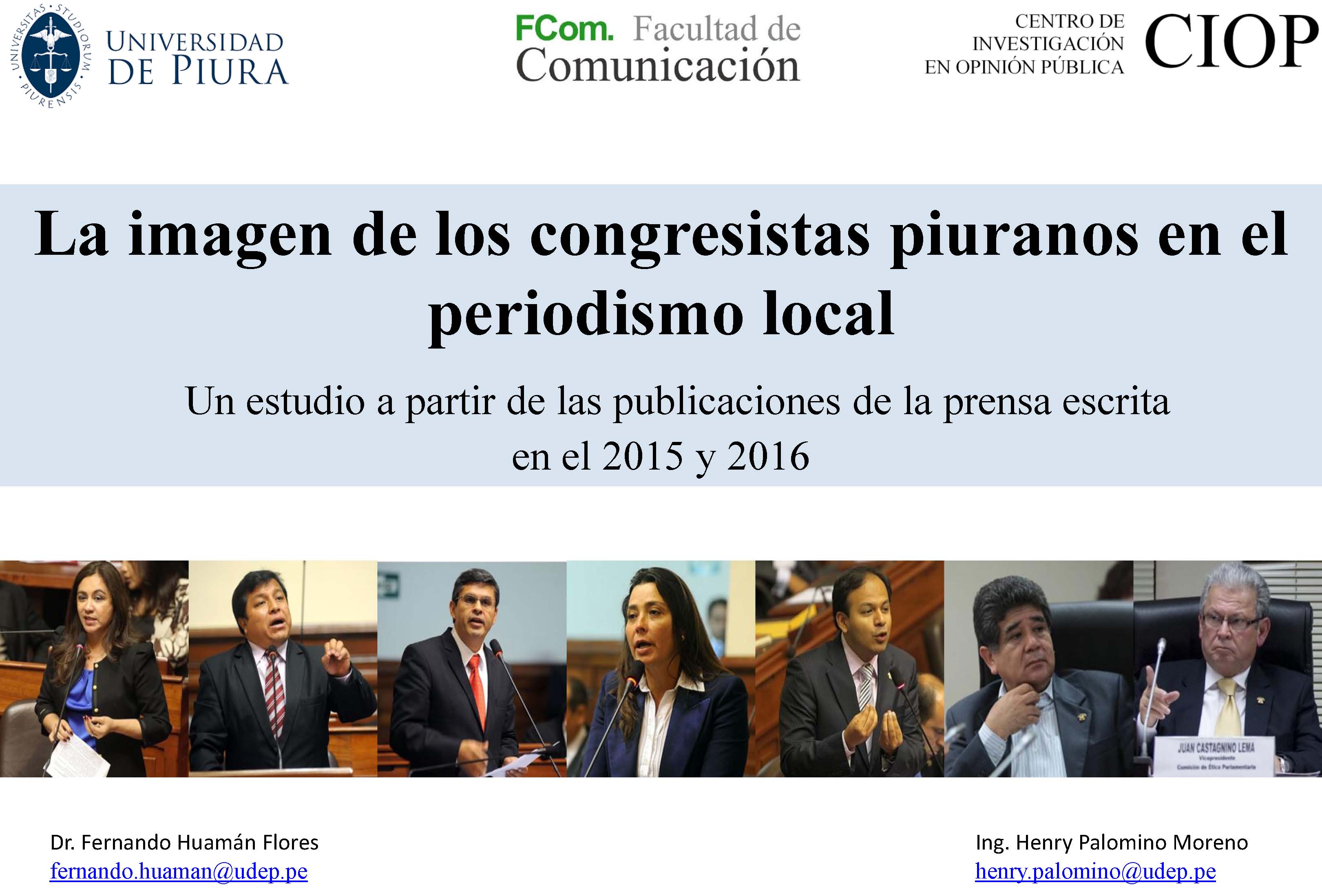 Después de analizar la información periodística de la prensa local entre el 2015 y el 2016, se evidencia que más de la mitad de lo publicado en los medios (58%) no se relaciona con las tareas ordinarias de los congresistas: únicamente el 9% de las noticias hacen referencia al trabajo legislativo, el 13% a la tarea de representación y el 20% a la función fiscalizadora. Así lo dio a conocer el estudio: “La imagen de los congresistas piuranos en el periodismo local”, presentado por el Centro de Investigación en Opinión Pública (CIOP) de la facultad de Comunicación de la Universidad de Piura (UDEP).