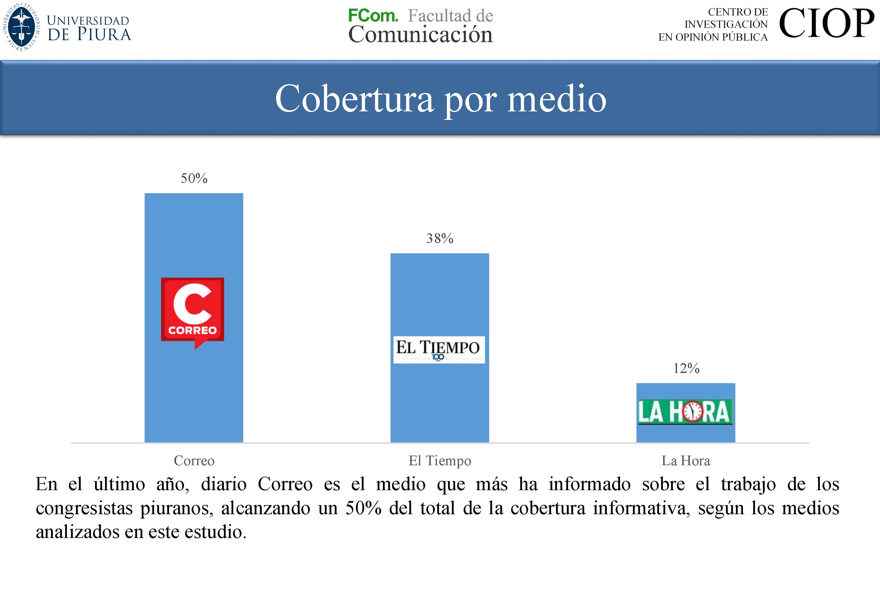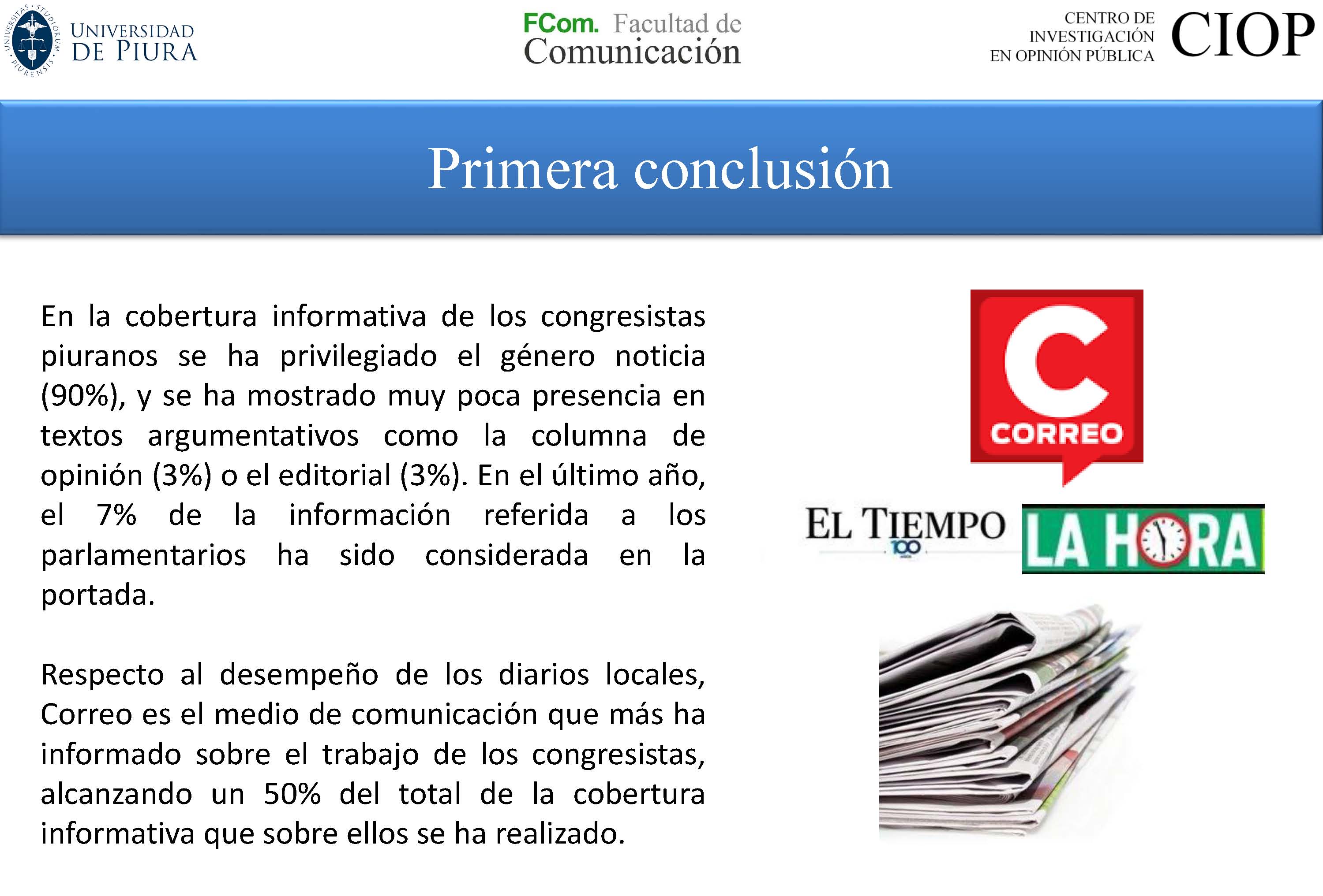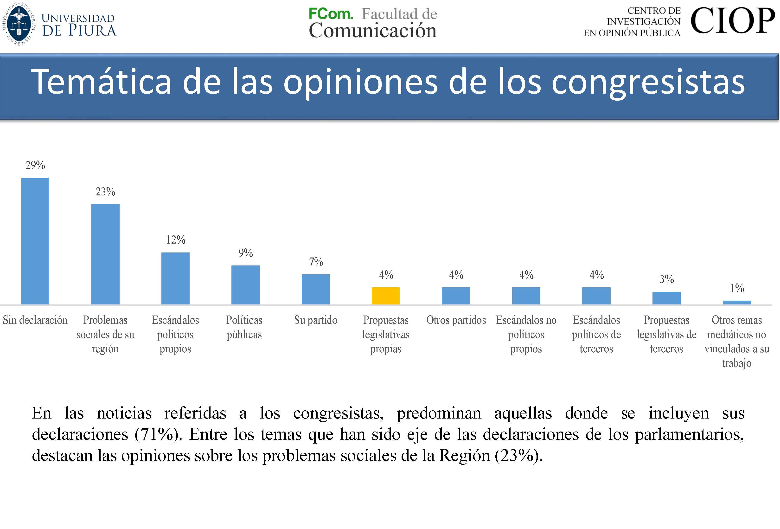 Después de analizar la información periodística de la prensa local entre el 2015 y el 2016, se evidencia que más de la mitad de lo publicado en los medios (58%) no se relaciona con las tareas ordinarias de los congresistas: únicamente el 9% de las noticias hacen referencia al trabajo legislativo, el 13% a la tarea de representación y el 20% a la función fiscalizadora. Así lo dio a conocer el estudio: “La imagen de los congresistas piuranos en el periodismo local”, presentado por el Centro de Investigación en Opinión Pública (CIOP) de la facultad de Comunicación de la Universidad de Piura (UDEP).