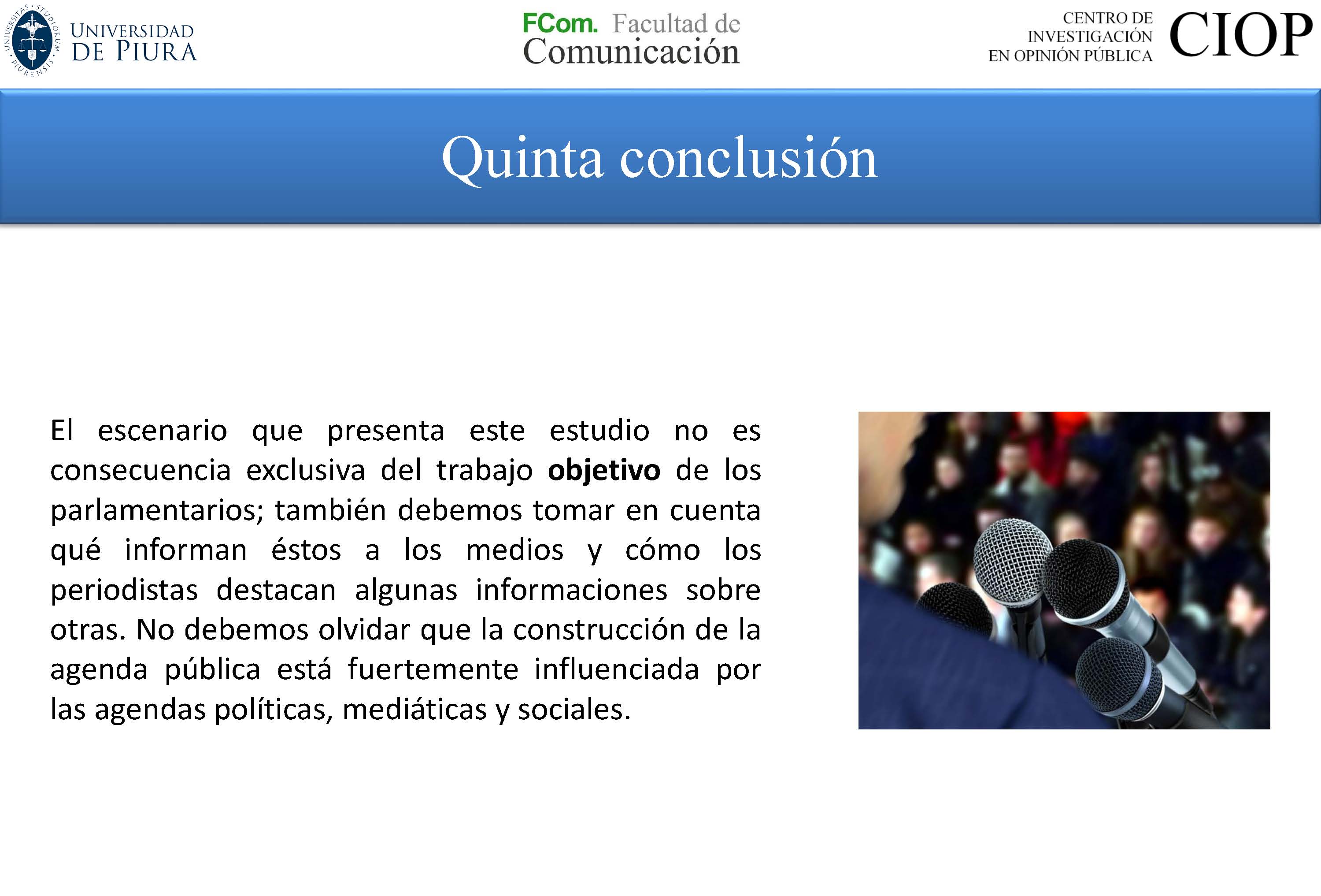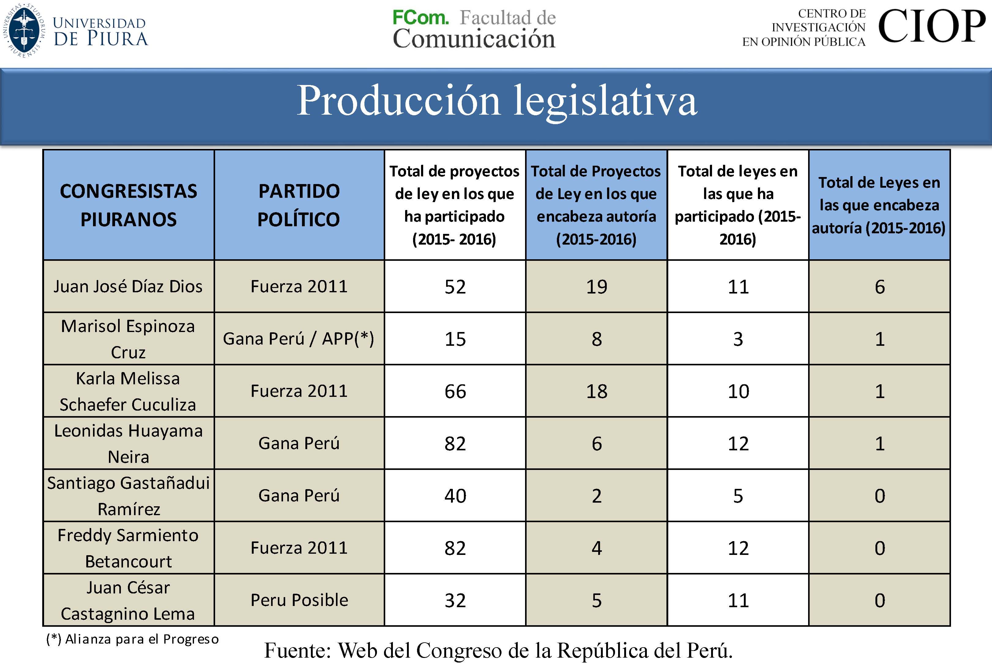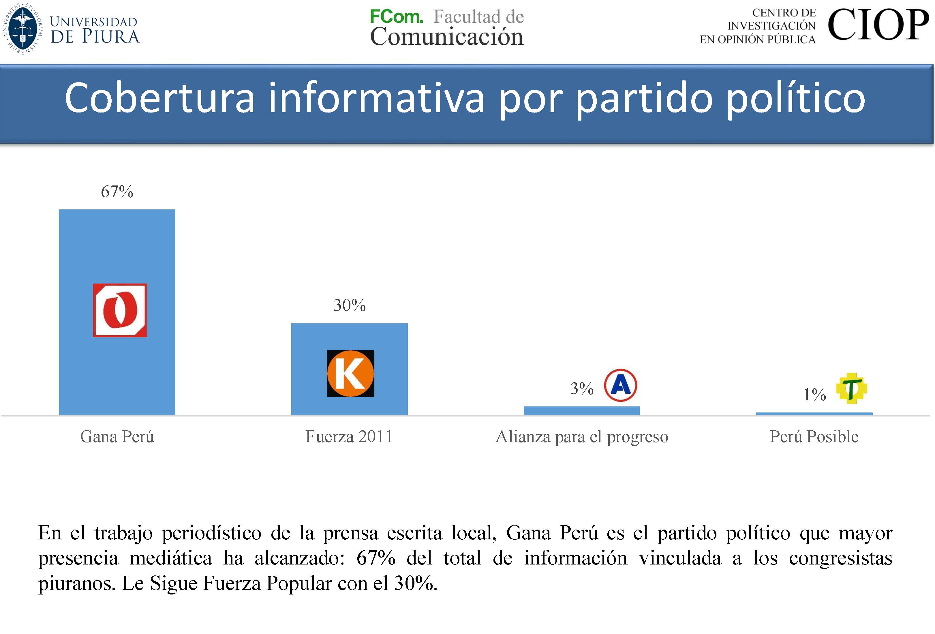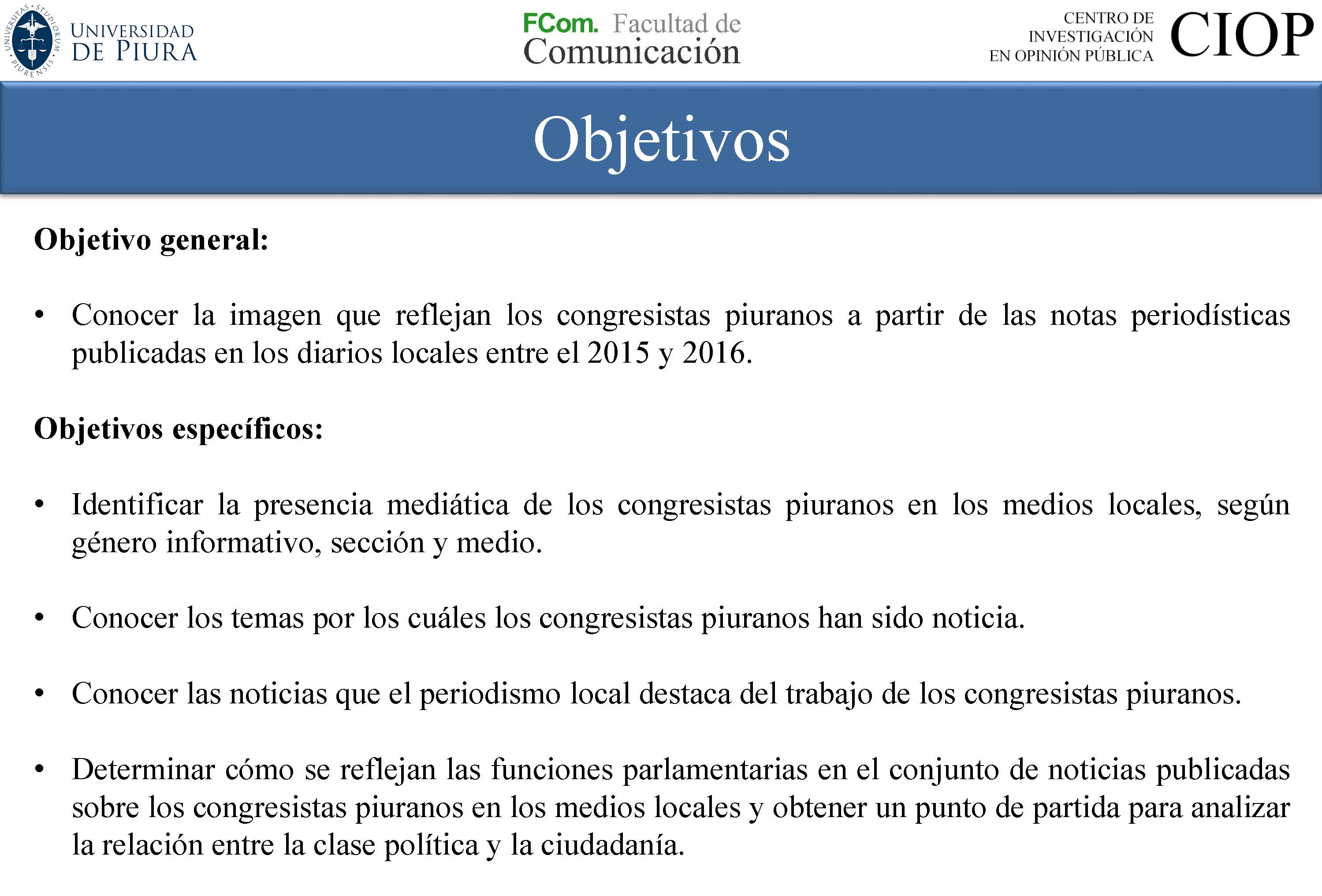 Después de analizar la información periodística de la prensa local entre el 2015 y el 2016, se evidencia que más de la mitad de lo publicado en los medios (58%) no se relaciona con las tareas ordinarias de los congresistas: únicamente el 9% de las noticias hacen referencia al trabajo legislativo, el 13% a la tarea de representación y el 20% a la función fiscalizadora. Así lo dio a conocer el estudio: “La imagen de los congresistas piuranos en el periodismo local”, presentado por el Centro de Investigación en Opinión Pública (CIOP) de la facultad de Comunicación de la Universidad de Piura (UDEP).