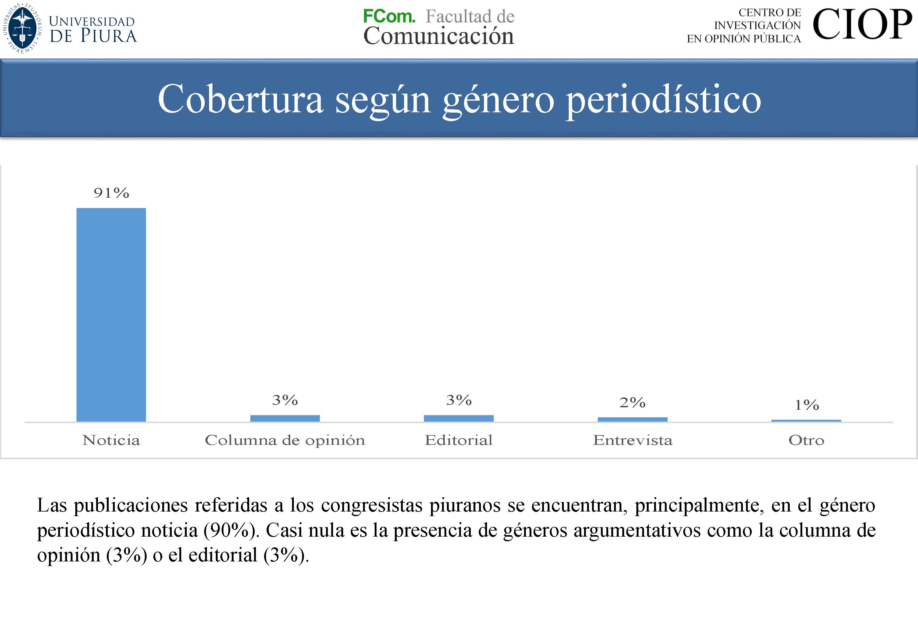 En el estudio se muestra que los diarios locales han privilegiado la información del género noticia (90%) y se han olvidado de fiscalizar por medio de editoriales o artículos de opinión, los mismos que apenas alcanzan el 3% de presencia informativa en el periodo de análisis. Por ello, el profesor Huamán Flores demandó que tanto los políticos como los medios contribuyan a visibilizar el papel fiscalizador, legislativo y representativo de los padres de la patria piuranos. “No debemos olvidar que una agenda pública responsable es consecuencia del trabajo de las agendas políticas, mediáticas y sociales”, aseguró.
