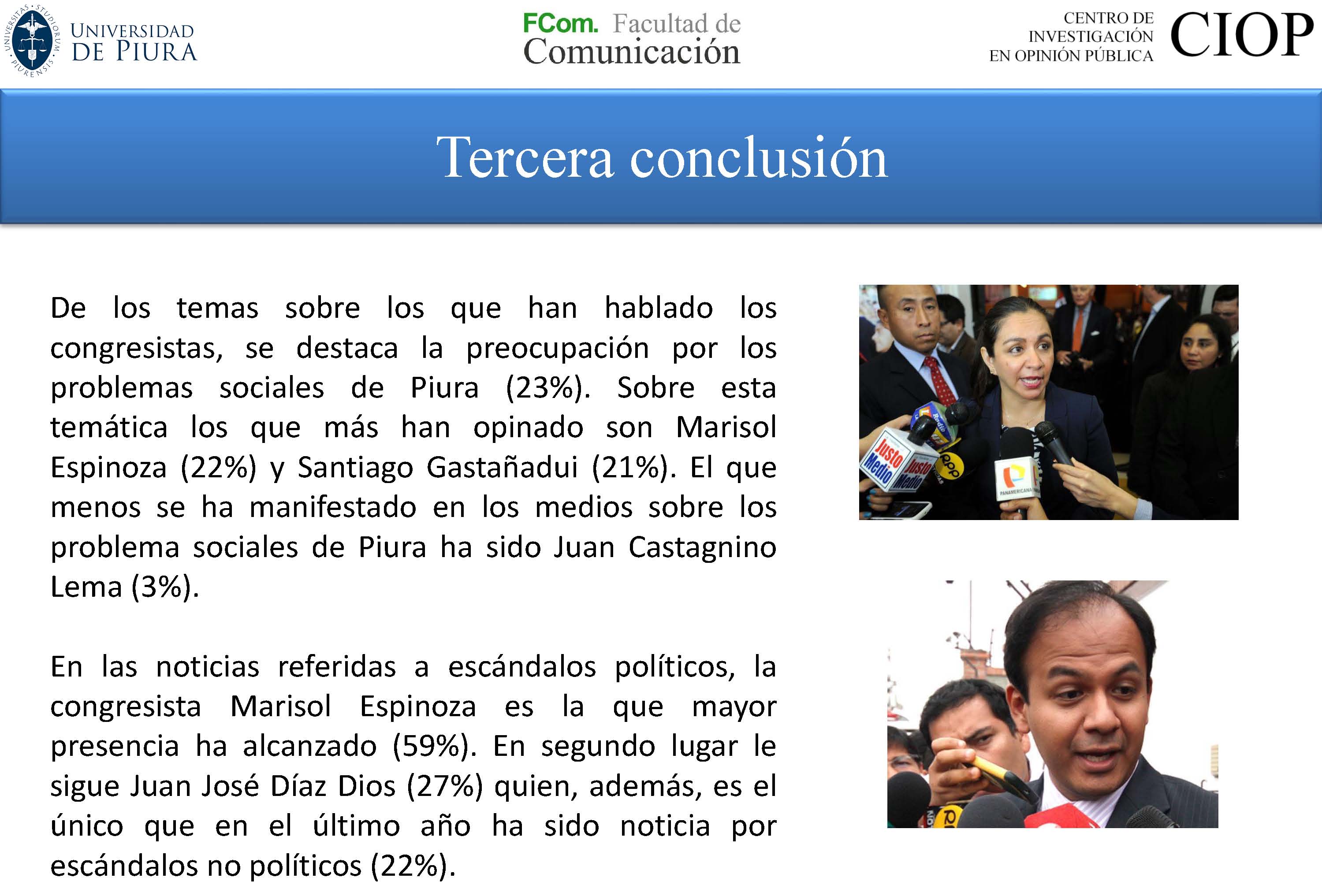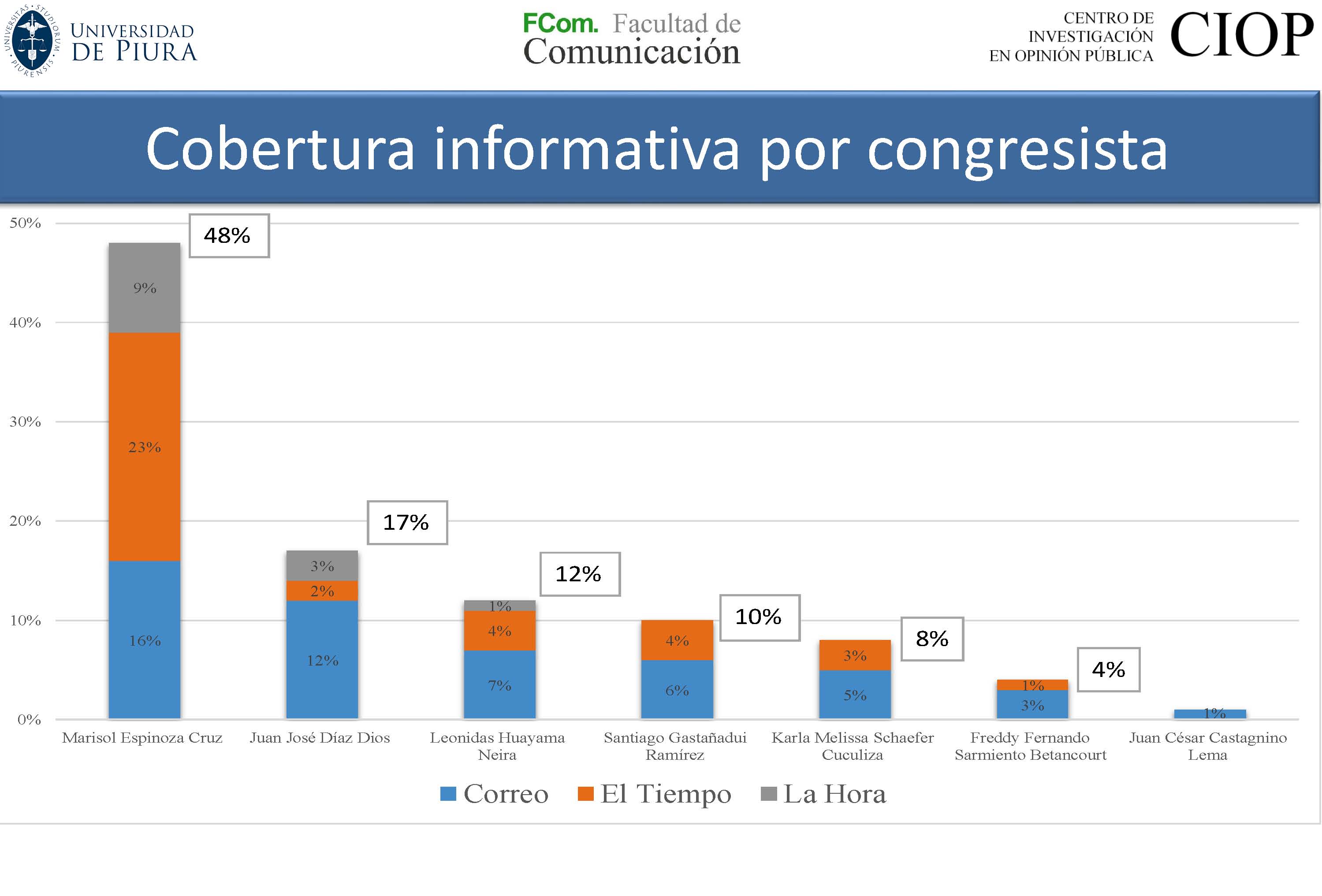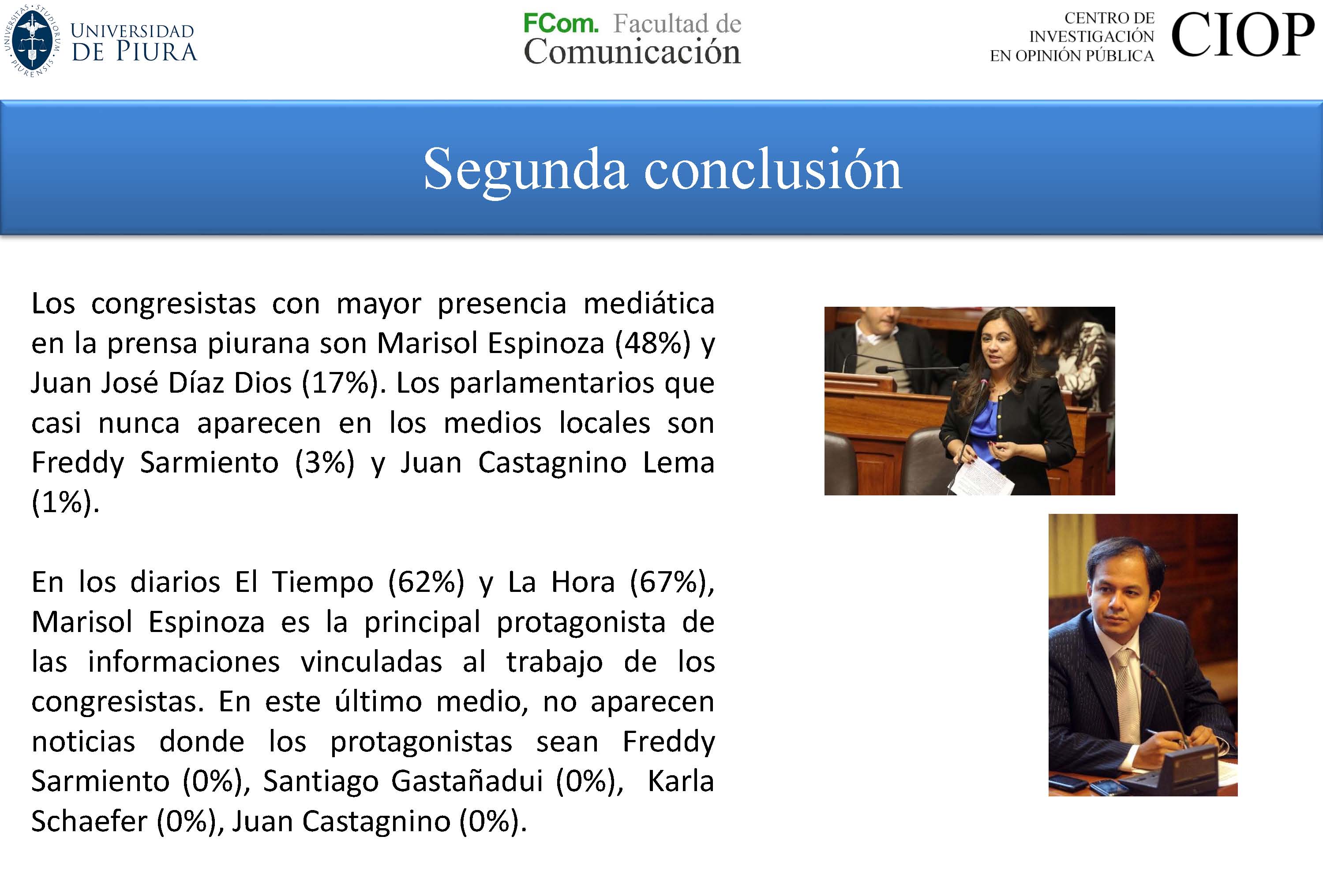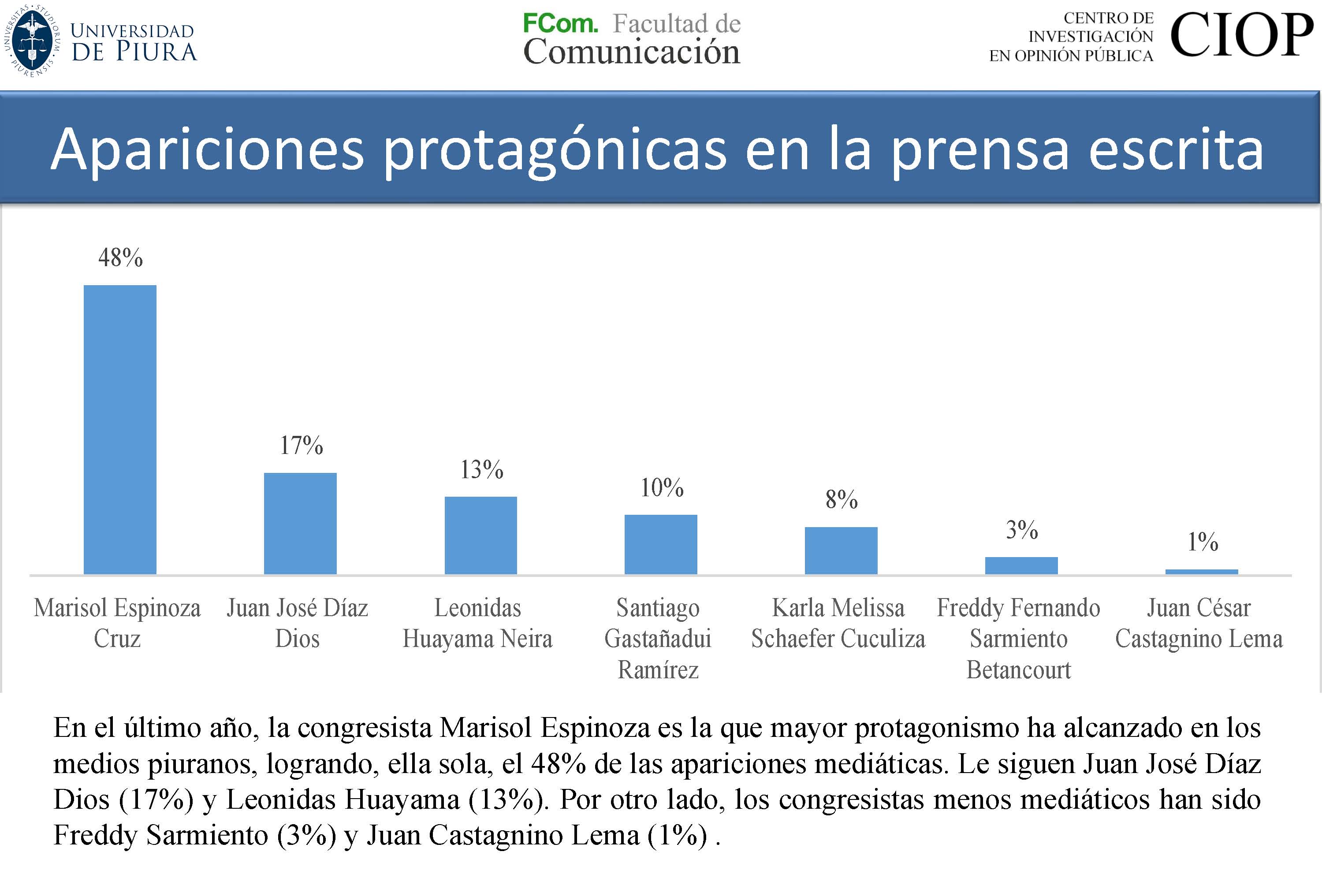 El estudio de la Universidad de Piura destacó que Marisol Espinoza y Juan José Díaz Dios son los congresistas que mayor impacto han alcanzado en la prensa local, logrando porcentajes de 48% y 17% de participación en información periodística, respectivamente. Este resultado contrasta con los porcentajes de Freddy Sarmiento (3%) y Juan Castagnino (3%), quienes prácticamente están ausentes en la opinión pública que se refleja en los medios.