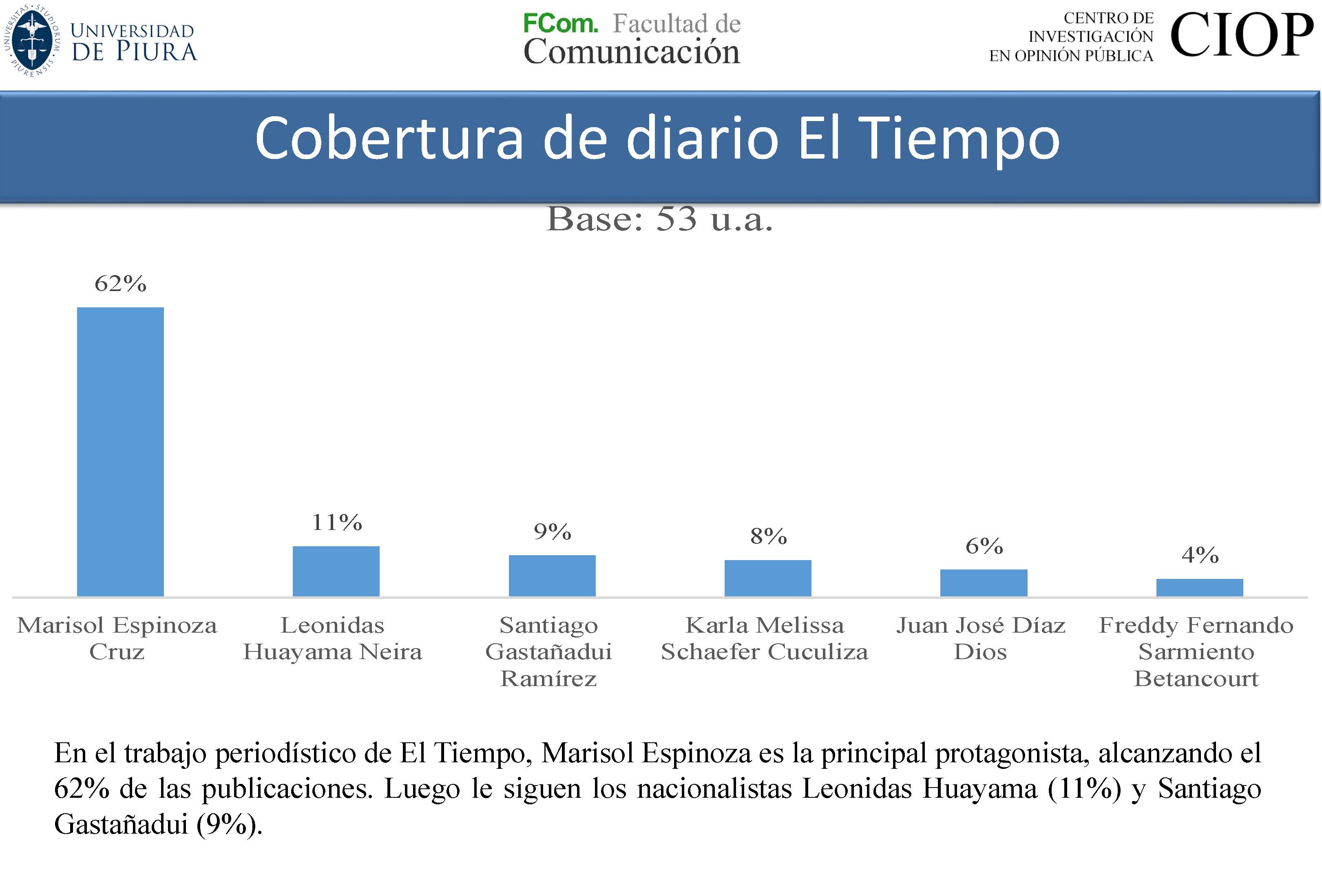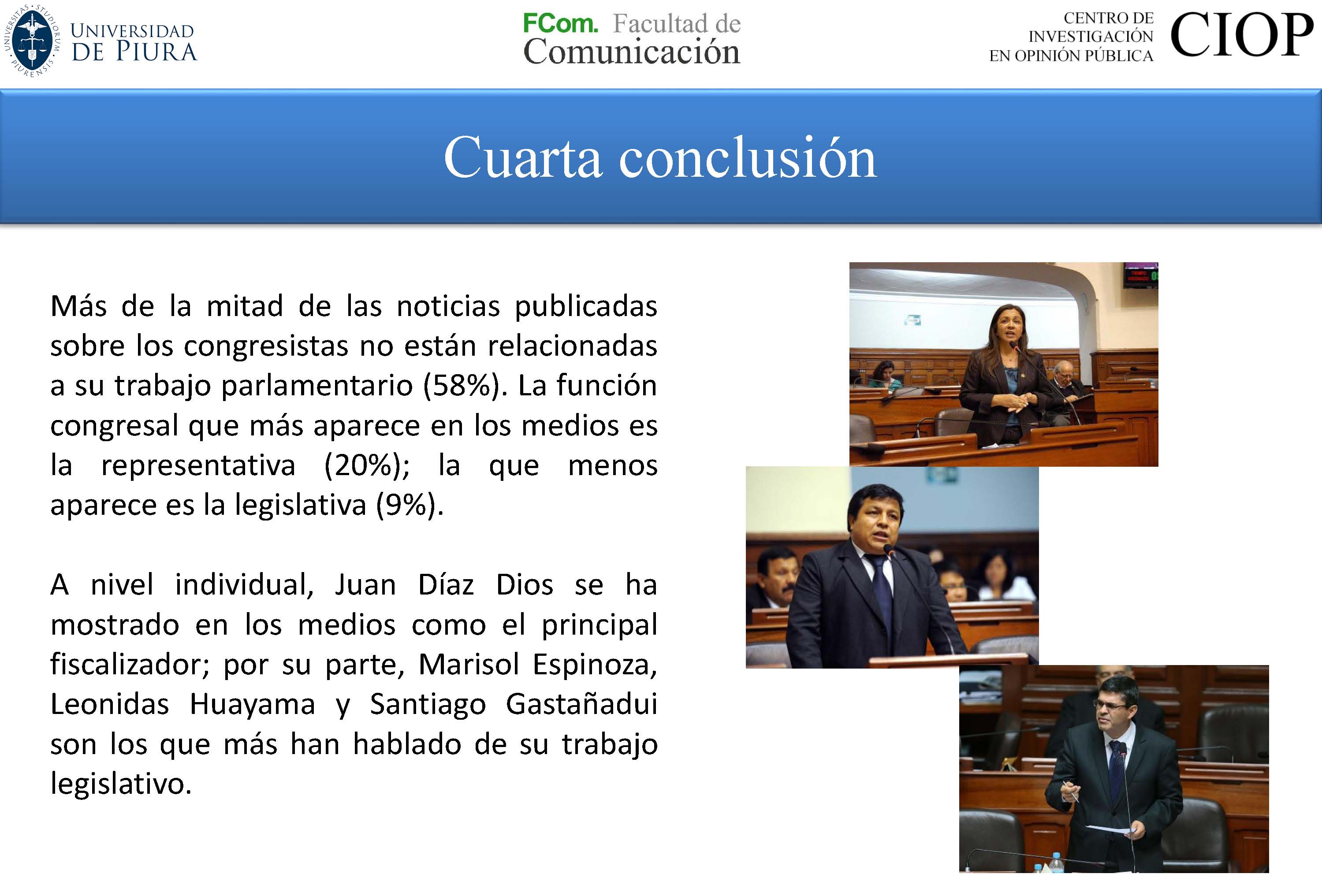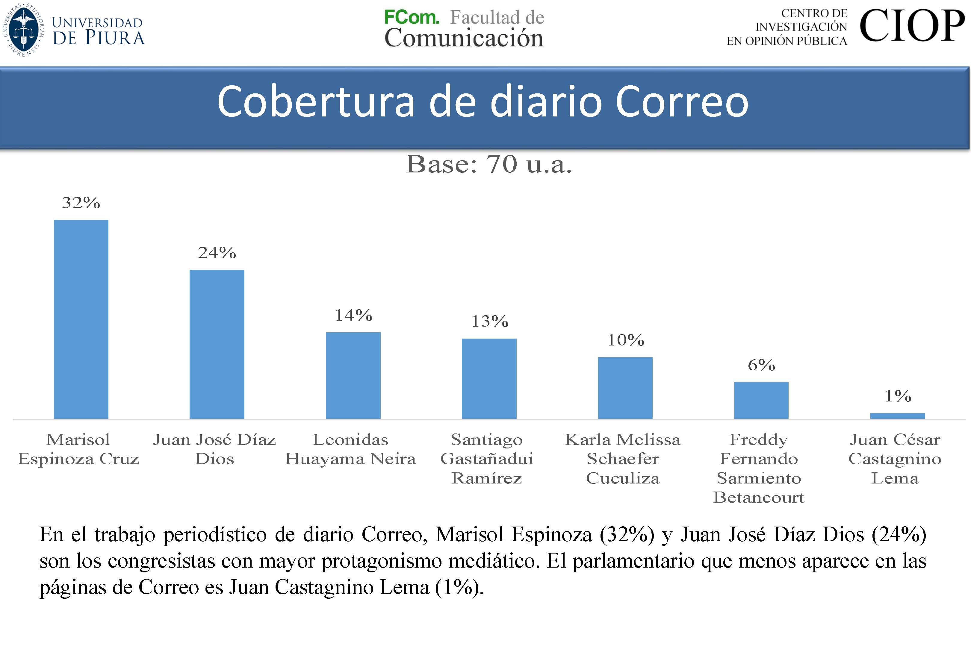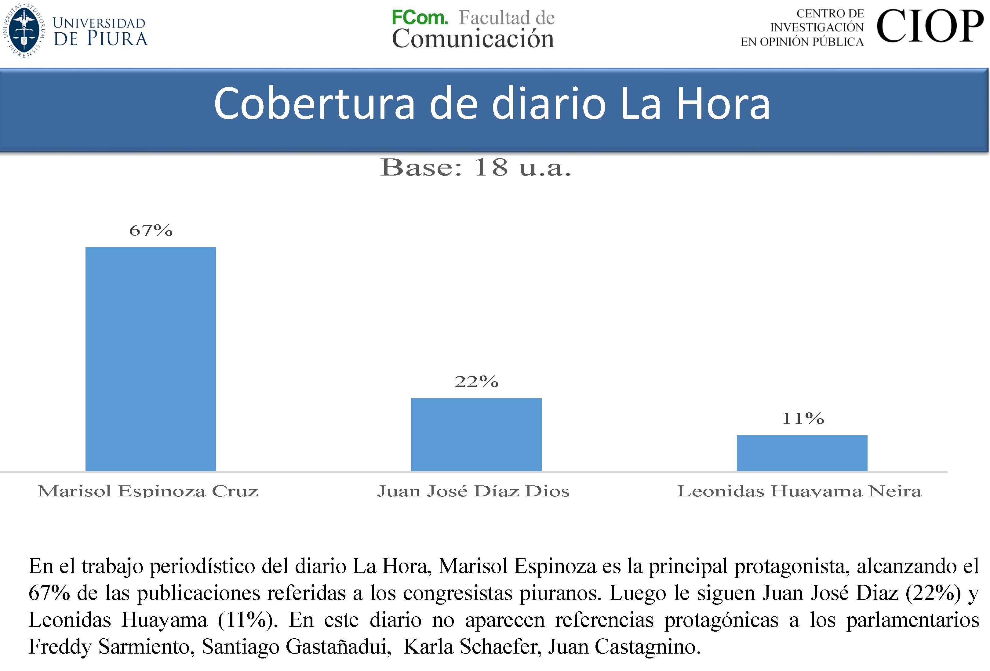 El estudio de la Universidad de Piura destacó que Marisol Espinoza y Juan José Díaz Dios son los congresistas que mayor impacto han alcanzado en la prensa local, logrando porcentajes de 48% y 17% de participación en información periodística, respectivamente. Este resultado contrasta con los porcentajes de Freddy Sarmiento (3%) y Juan Castagnino (3%), quienes prácticamente están ausentes en la opinión pública que se refleja en los medios.