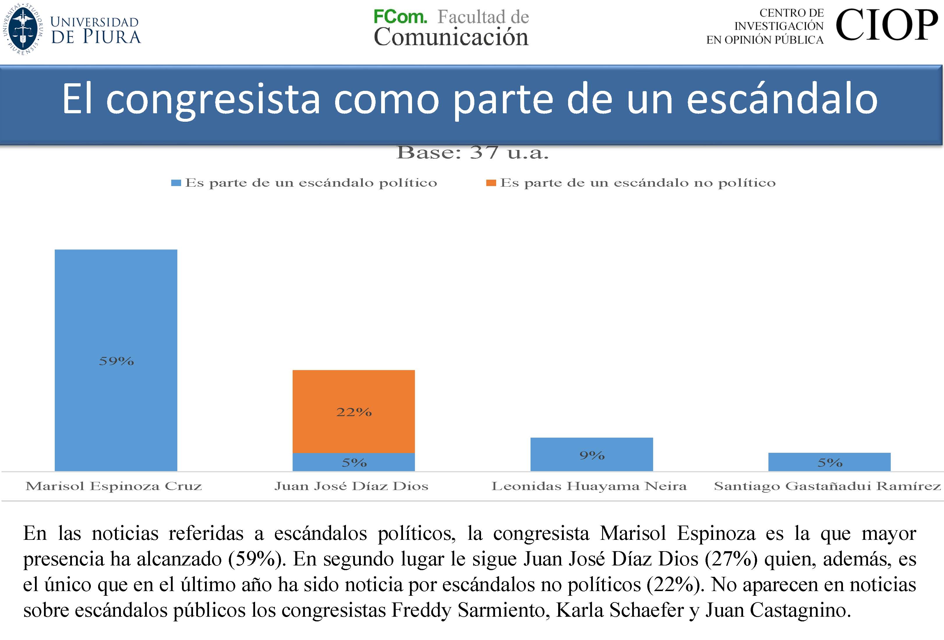 El informe del CIOP también analizó qué tan presente están los congresistas en información relacionada a escándalos políticos y no políticos. Los parlamentarios que destacan en este aspecto son Marisol Espinoza y Juan José Díaz, quienes poseen el 59% y 27% de información sobre esta temática. Por su parte, el congresista de Fuerza Popular es el único que presenta escándalos no políticos en el último año.
