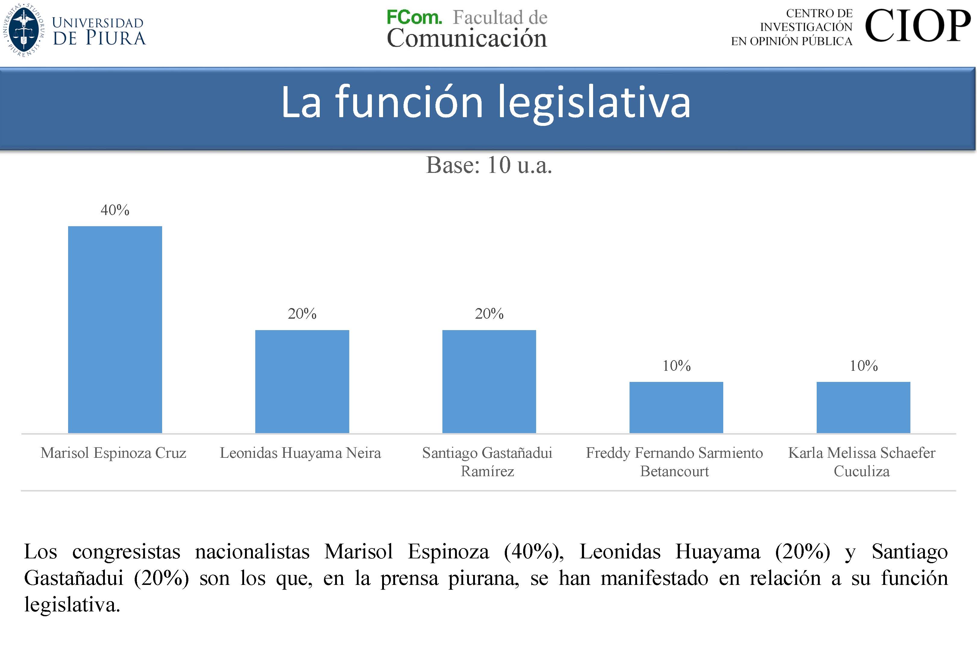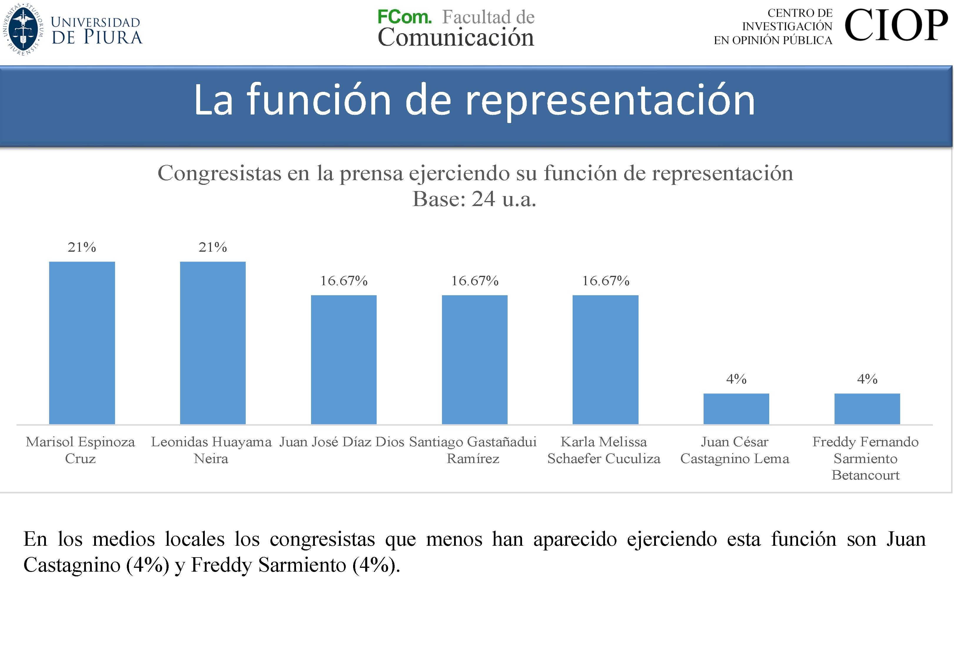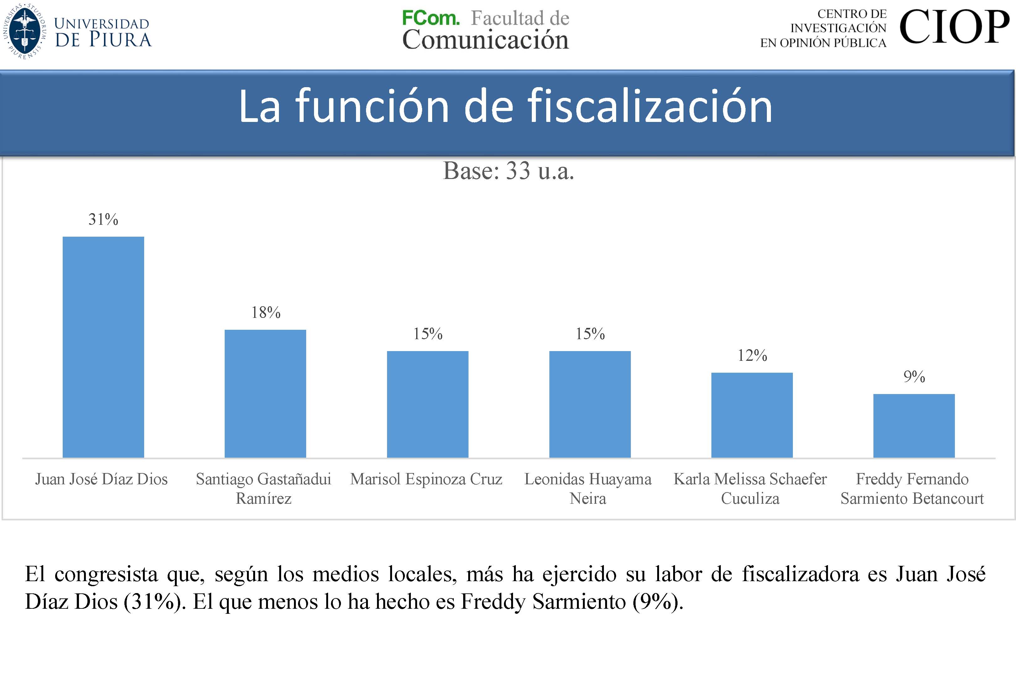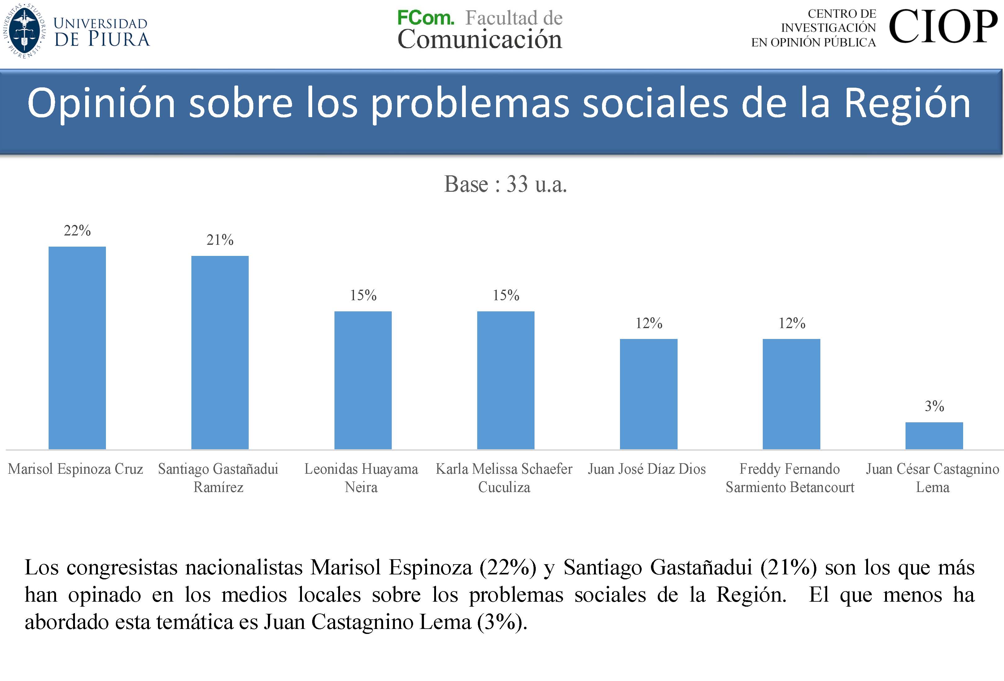 El estudio también revela que, a nivel individual, Juan José Díaz se ha mostrado en los medios como el principal fiscalizador. Por su parte los Congresistas Marisol Espinoza (40%), Leonidas Huayama (20%) y Santiago Gastañadui (20%) son los que más han hablado de su trabajo legislativo. De estos, los dos primeros son quienes destacan, además, por sus opiniones respecto a los problemas sociales de la Región. El que menos se ha manifestado en los medios sobre la problemática social de Piura ha sido Juan Castagnino Lema (3%).