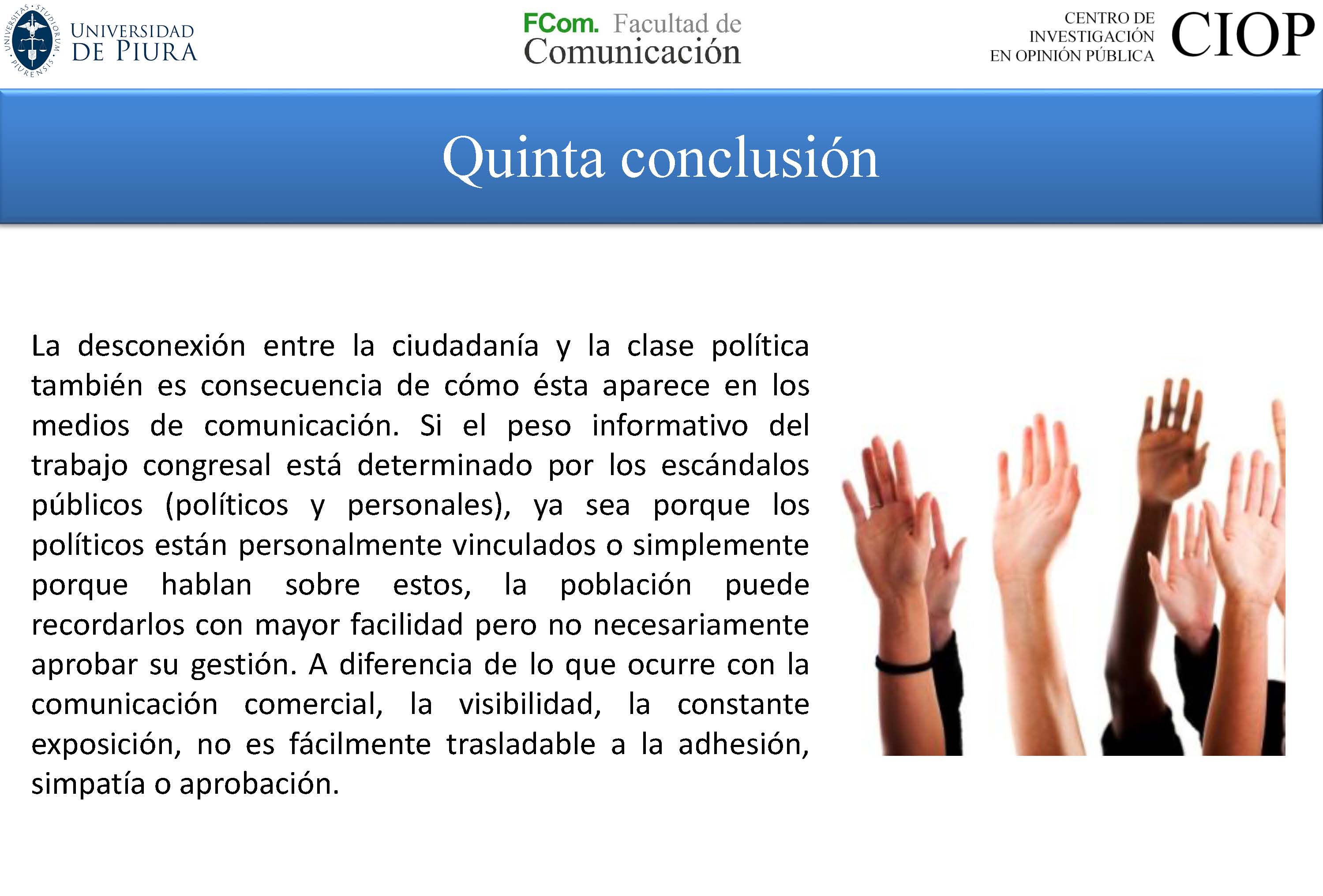 Los resultados fueron presentados por el doctor Fernando Huamán Flores, experto en opinión pública y director del CIOP. En su exposición, destacó que “la desconexión entre la ciudadanía y la clase política también es consecuencia de cómo ésta aparece en los medios de comunicación. Si el peso informativo del trabajo congresal está determinado por los escándalos públicos, ya sea porque los políticos están personalmente vinculados o simplemente porque hablan sobre estos, la población puede recordarlos con mayor facilidad pero no necesariamente aprobar su gestión”.