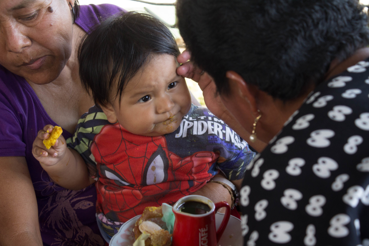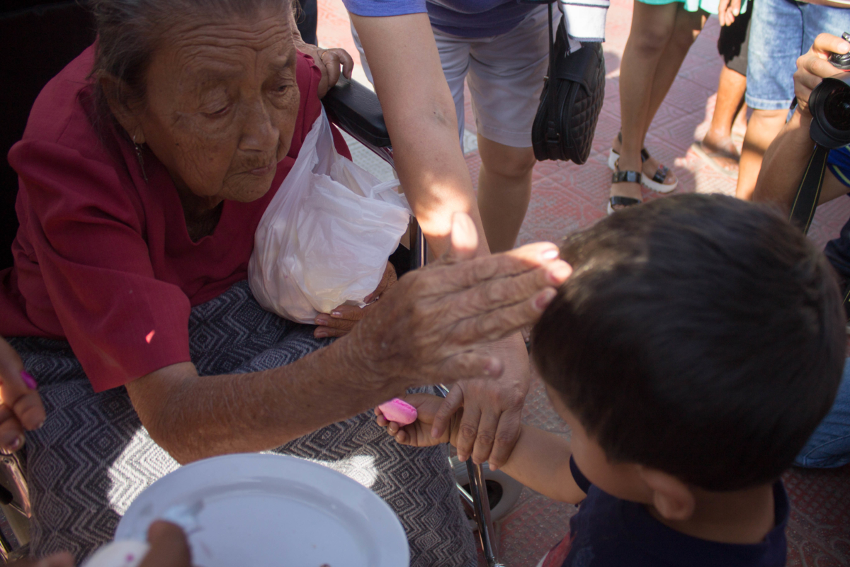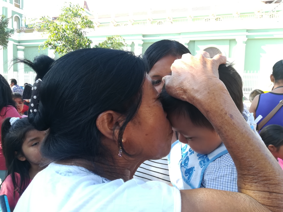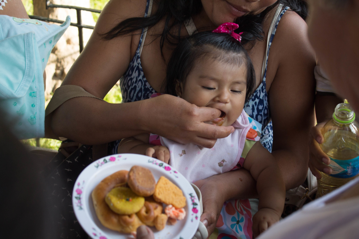 Así en medio de toda la gente que ocupa la plaza central del pueblo, ella busca a un niño que tenga la edad del pariente que perdió. Parte un poco de la galleta, lo mezcla con miel y se lo da de comer al niño diciendo «come por mi hijito, que en paz descanse».