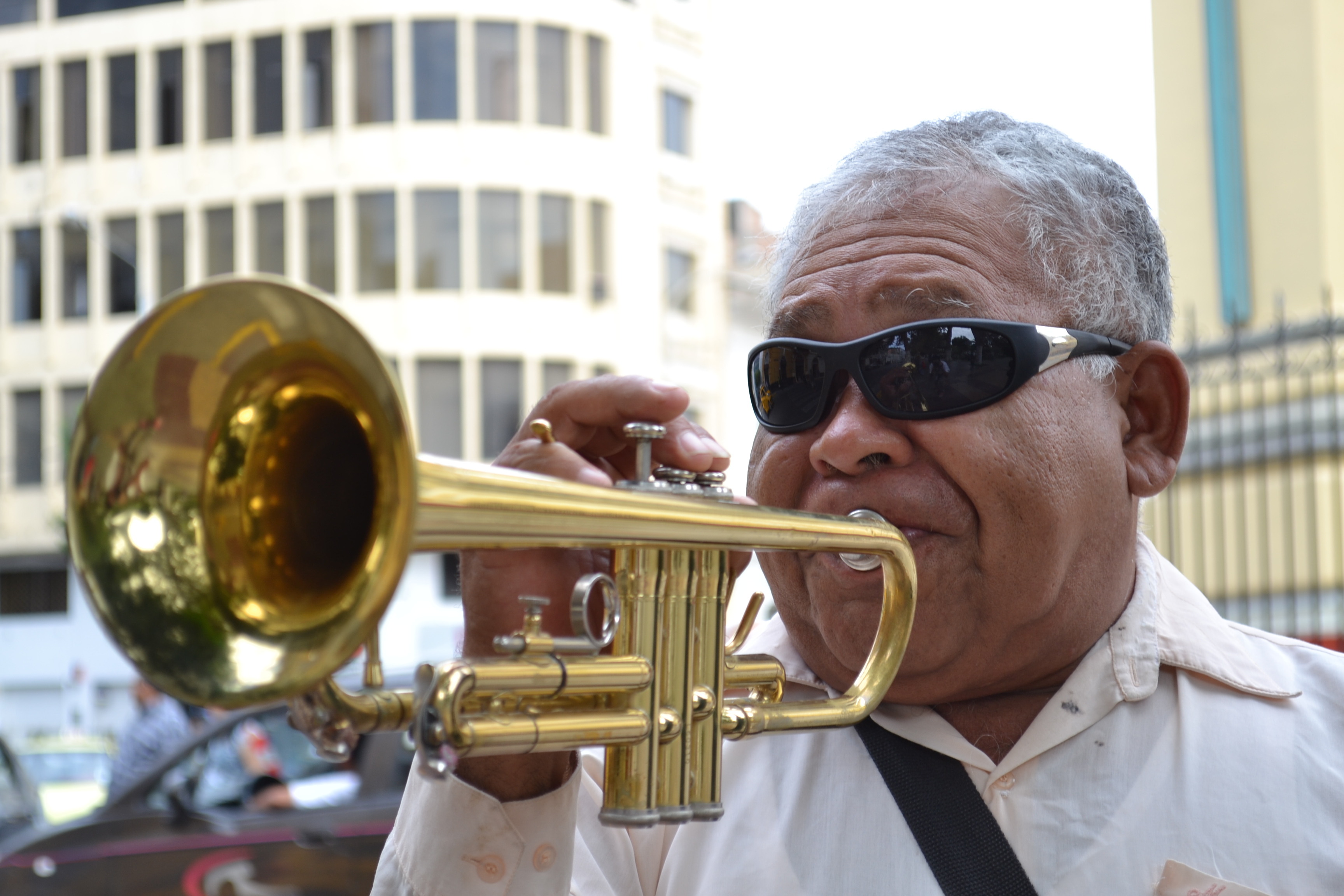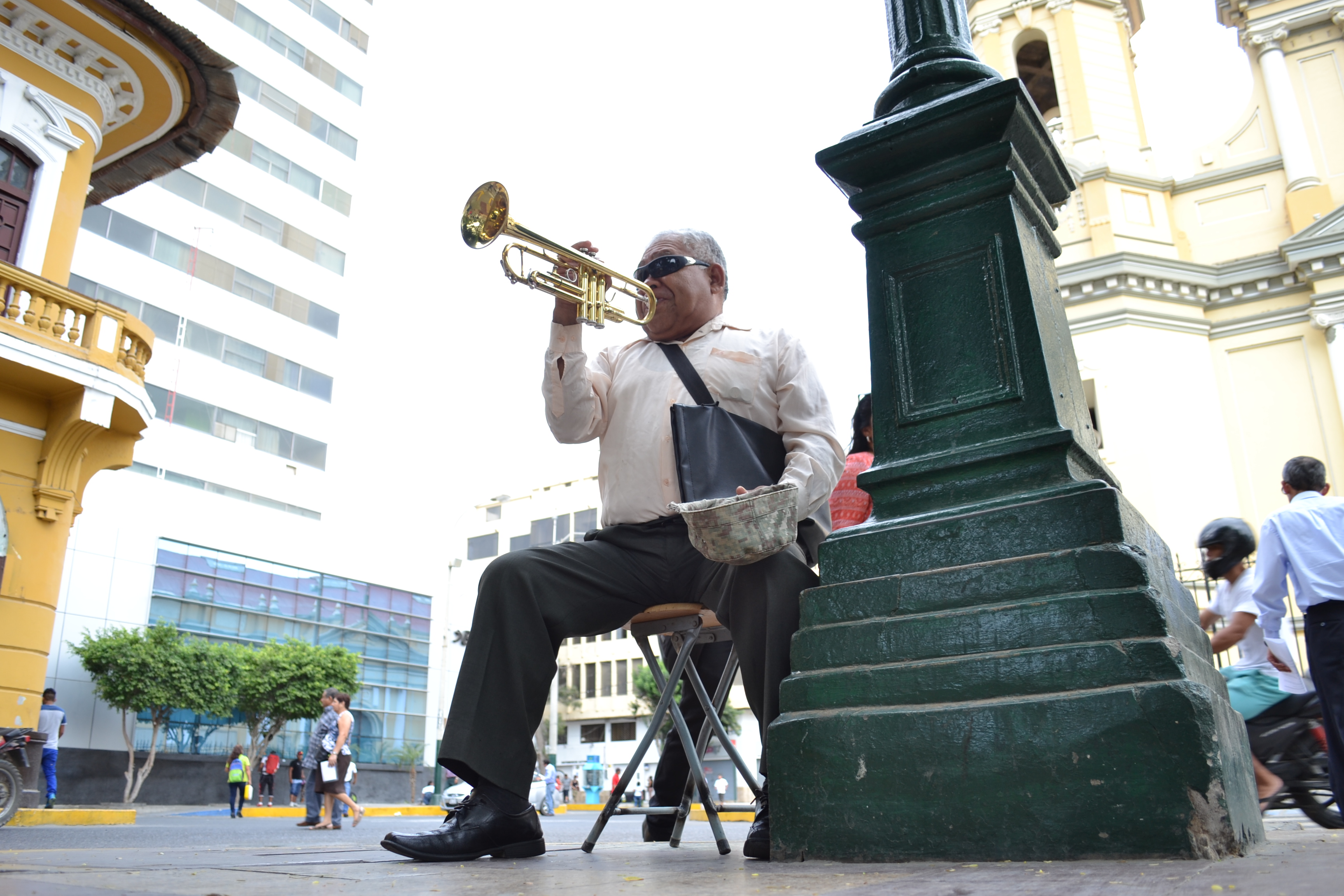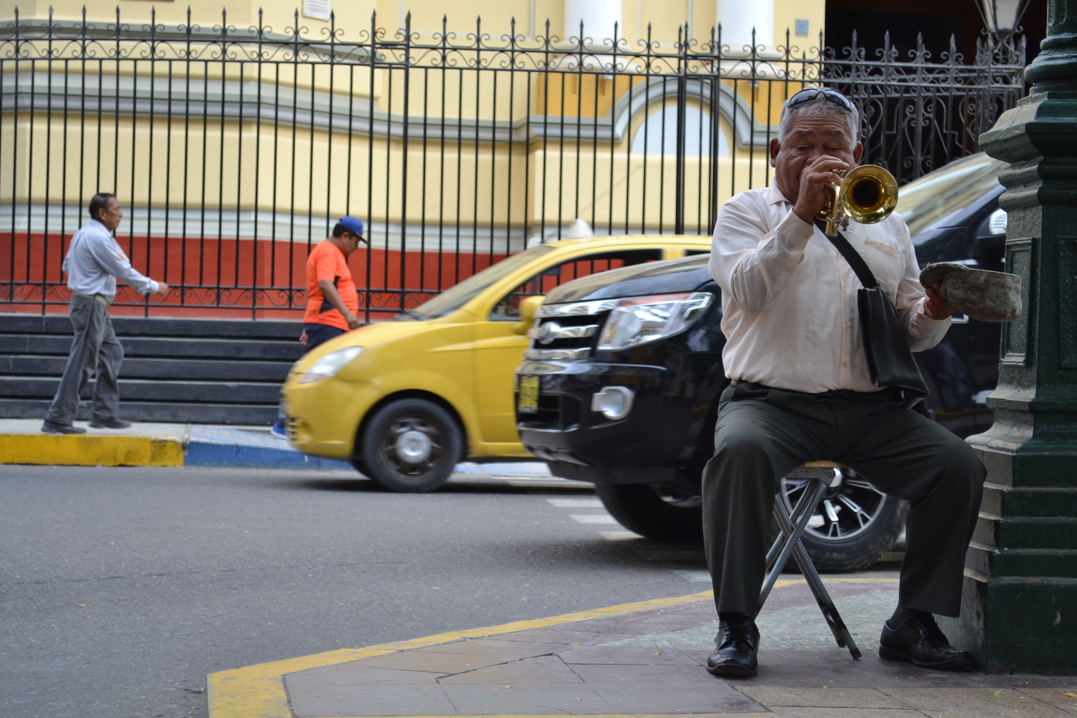Encontramos al señor Juan Eduardo Masías Ortiz, de 65 años, en una esquina de la Plaza de Armas frente a la Catedral, tocando la trompeta con la mano derecha y con la izquierda sosteniendo un gorro, esperando recibir una propina de alguien que valore su trabajo, alguien que se sensibilice con su música. Hace dos semanas, Juan regresó a Piura después de recorrer algunas ciudades del país, y desde que llegó, la Plaza de Armas se inundó de notas musicales. El trompetista se quedará una semana más. Suele tocar de 9 a 11:30 de la mañana,y de 5 a 7:30, por las tardes.