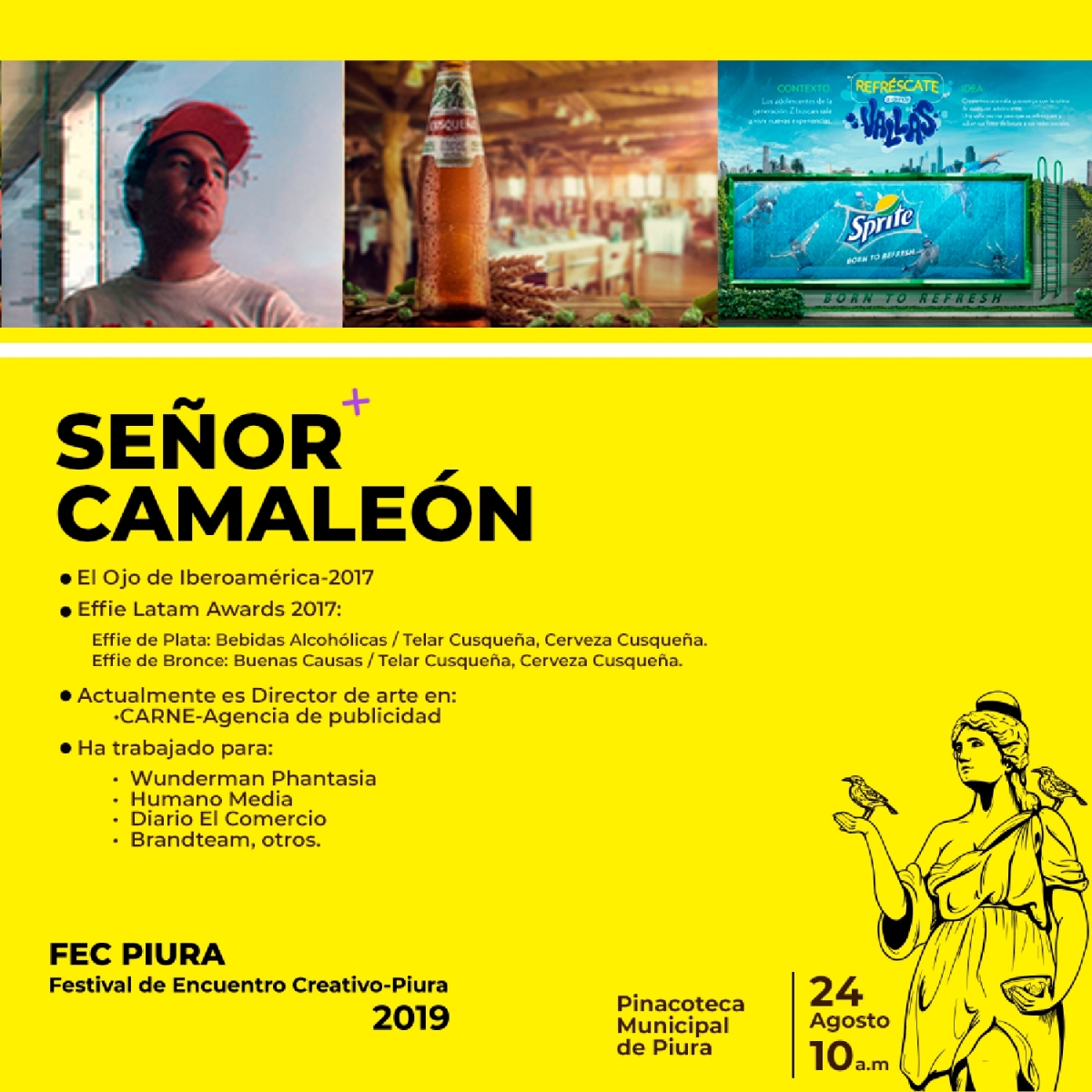 Y por último, pero no menos importante, Señor Camaleón, quien es diseñador, animador y especialista en retoque digital. Ganador de El Ojo de Iberoamérica 2017 y del Effie LatamAward 2017. Actualmente, es director de arte en CARNE Agencia de Publicidad.