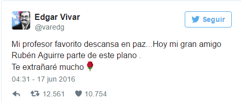 Sus compañeros de la serie El Chavo del 8 publicaron en las redes sociales mensajes y fotos en las que aparecen junto al recordado actor Rubén Aguirre que participó en otras series junto al también fallecido Roberto Gómez Bolaños.