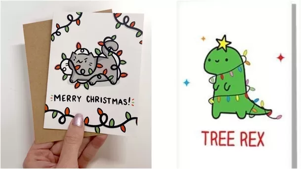 Las tarjetas decoradas con doodles, pictogramas y dibujos para colorear suelen elaborarse con plumones y marcadores, siguiendo patrones sencillos. Los modelos incluyen personajes como renos, pingüinos, galletas y figuras en blanco y negro pensadas para colorear.