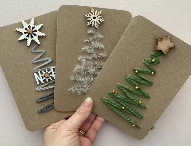 Otra alternativa consiste en emplear técnicas de bordado sobre cartulina o papel resistente. Se utilizan agujas e hilos decorativos para formar figuras alusivas a la temporada, como árboles o adornos. Para complementar, algunos diseños incorporan piezas de bisutería.