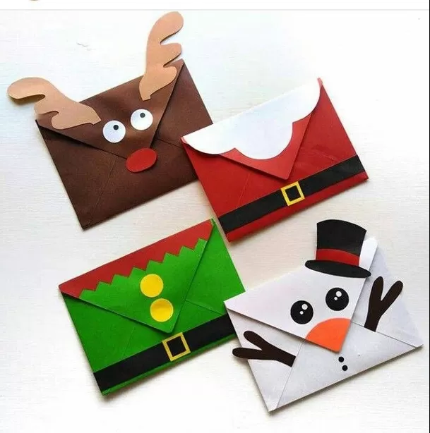 Los sobres decorados a mano sirven para complementar tarjetas de tamaño pequeño. Se elaboran con cartulinas o papeles de colores, combinando figuras geométricas para dar forma a diseños navideños.