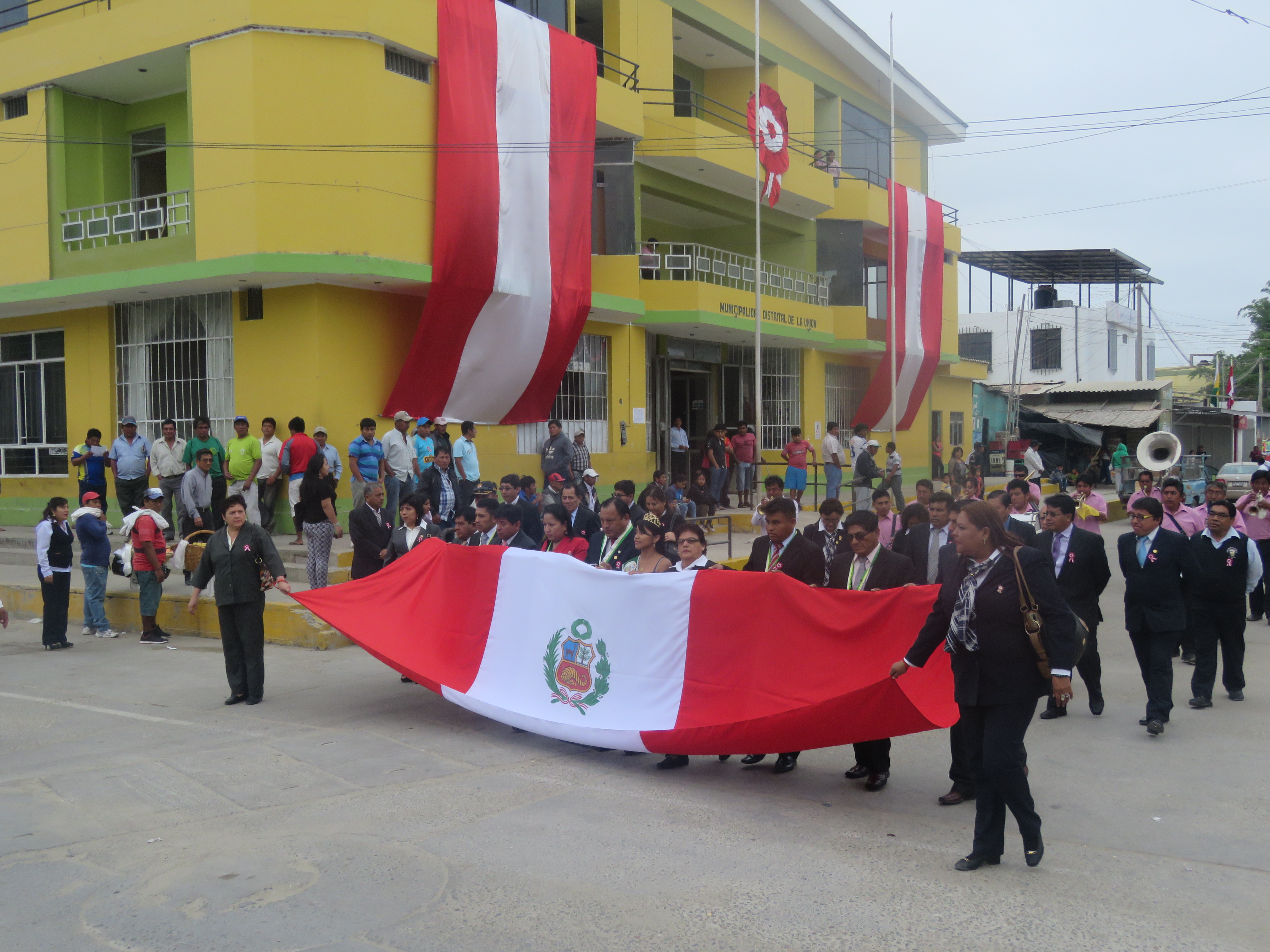 El acto protocolar inició a las 9:30 am con el paseo de la Bandera hasta la Plaza Principal, izamiento de banderas y entonación de himnos, presididos por el alcalde de La Unión Walter Ayala Antón.