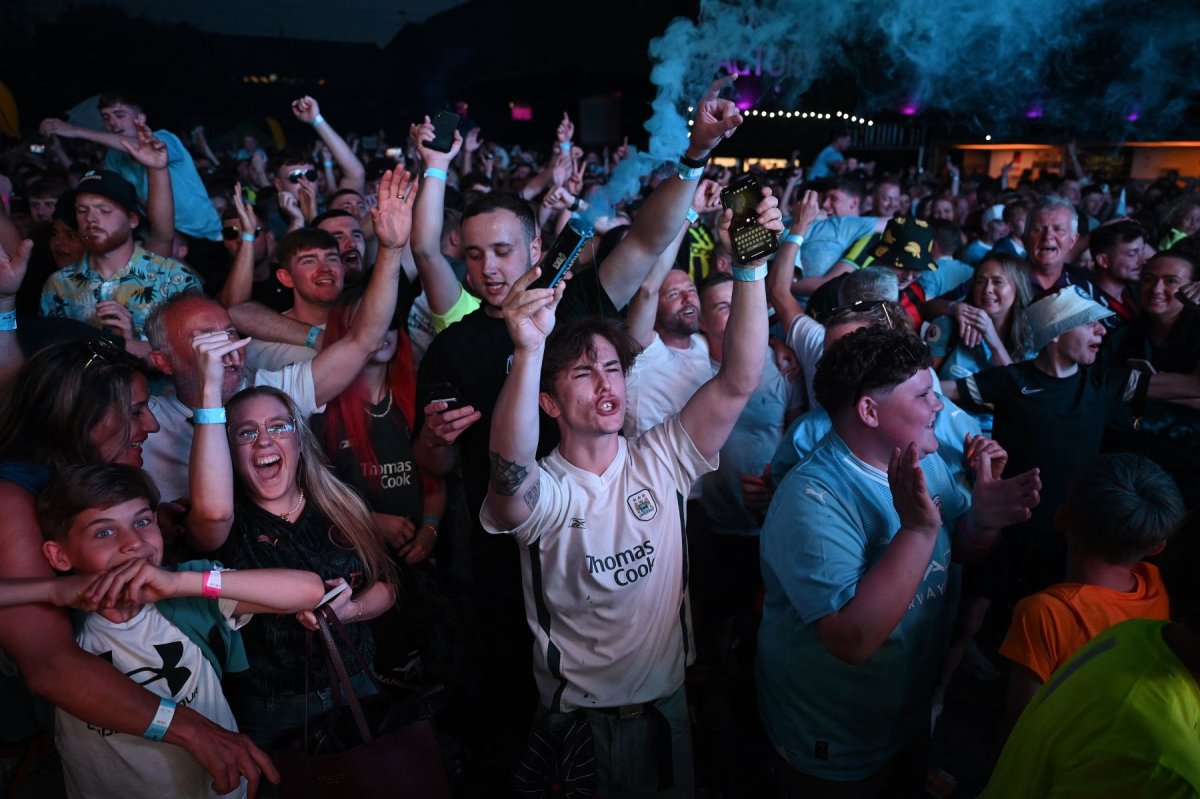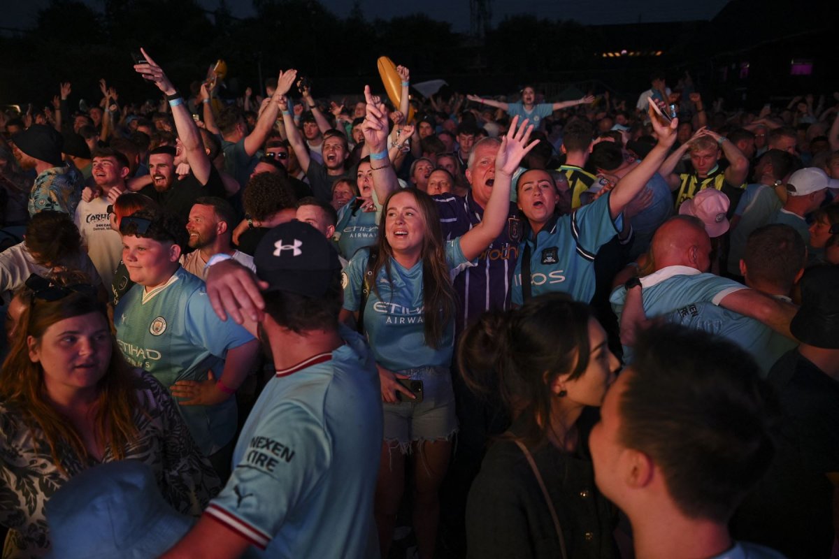 Los fanáticos del Manchester City celebran después de que su club venciera al Inter de Milán para ganar el partido de fútbol final de la Liga de Campeones de la UEFA en Estambul en el 4TheFans Fan Park en Manchester, norte de Inglaterra, el 10 de junio de 2023. Foto: AFP