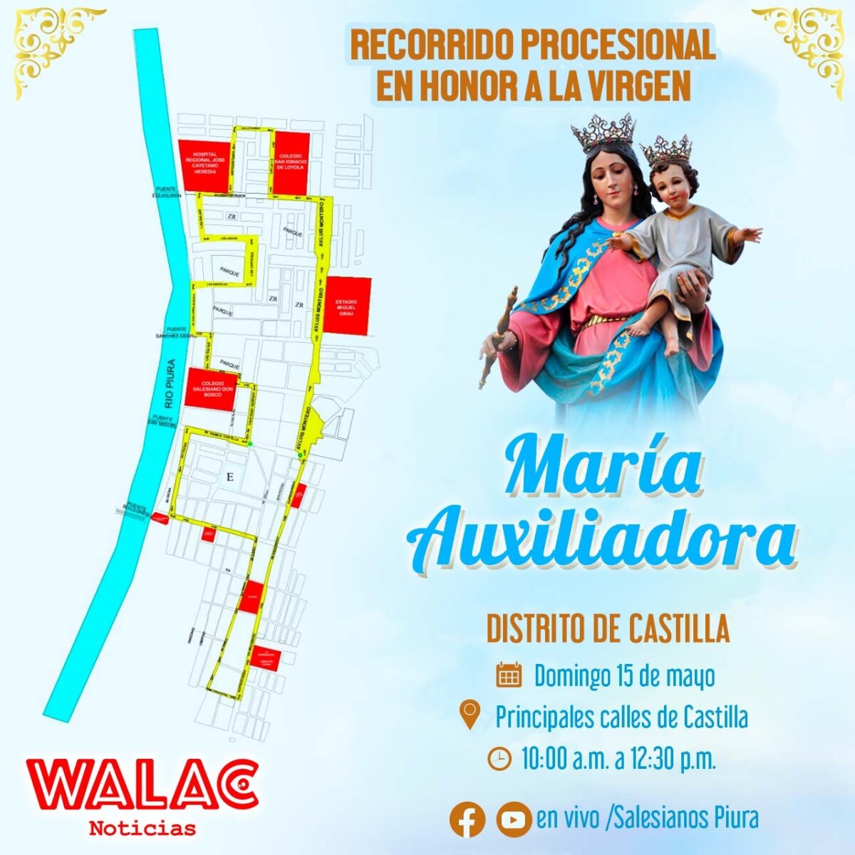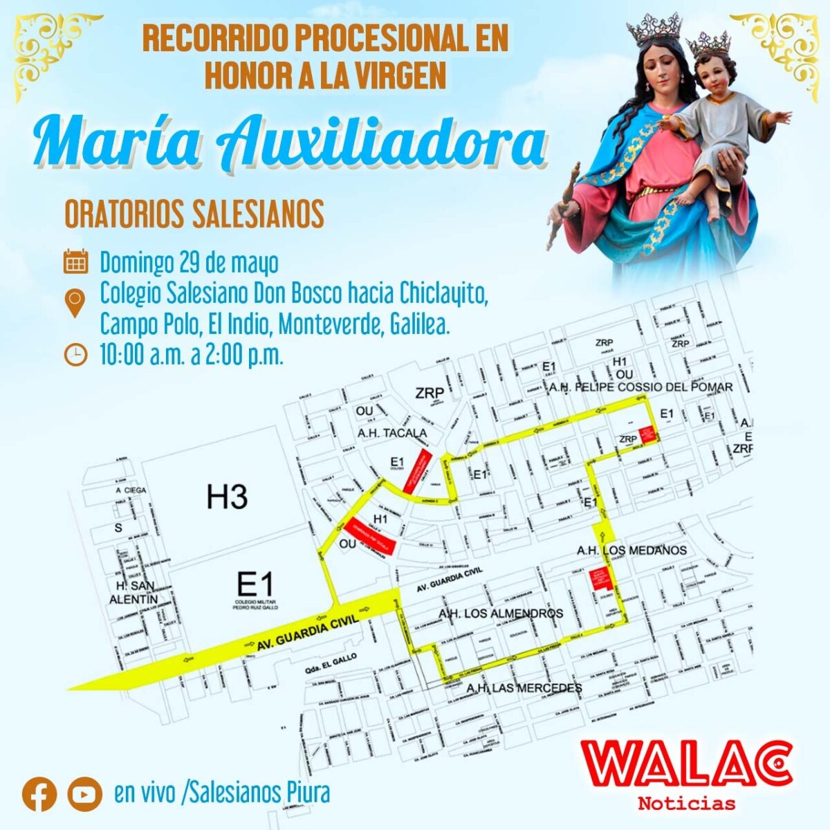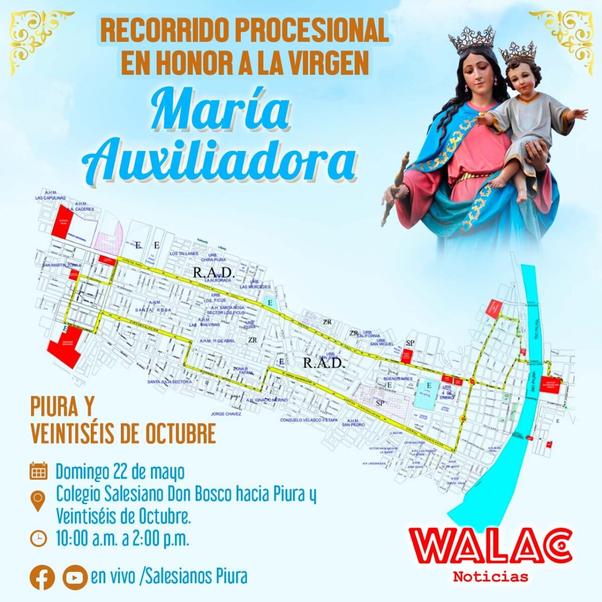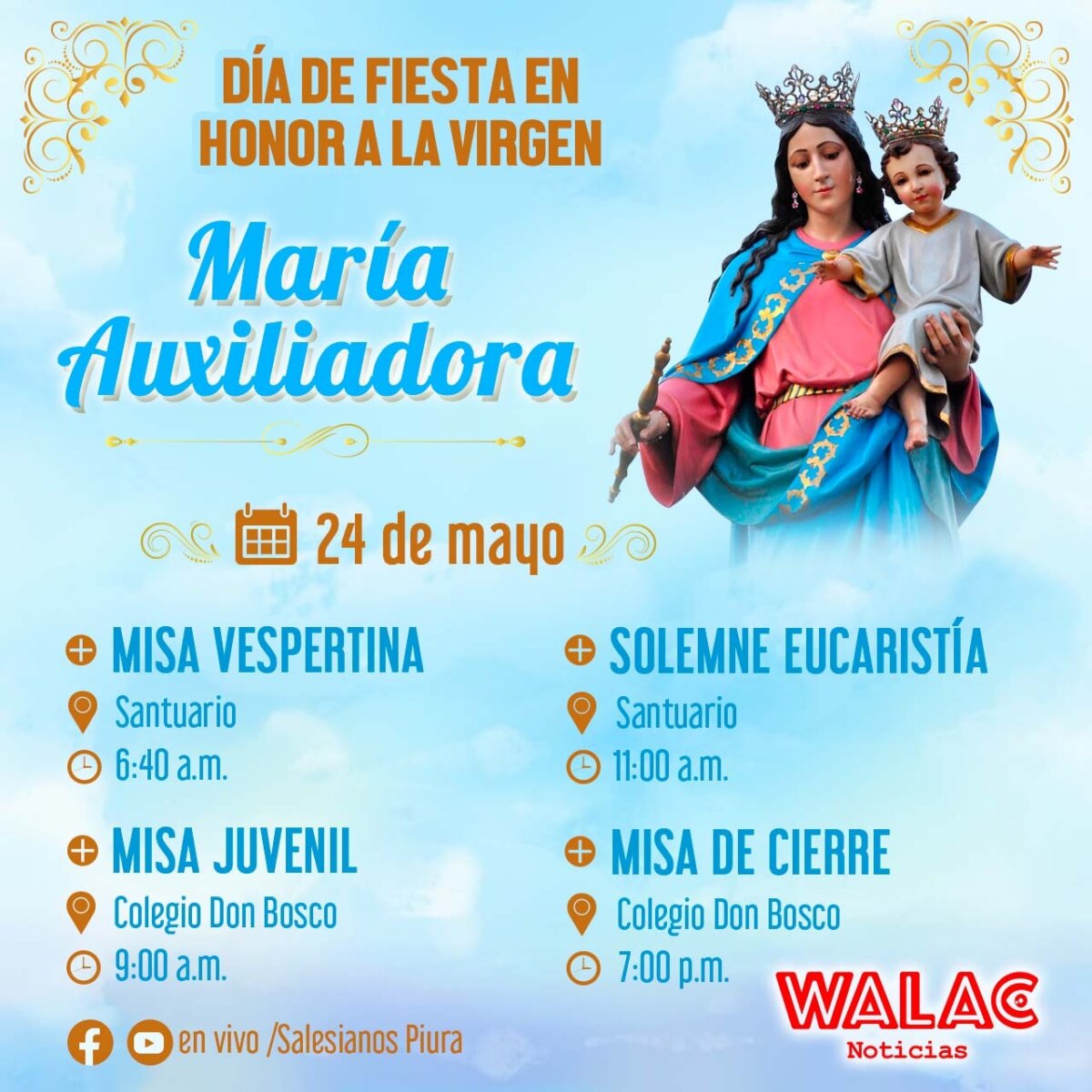 Después de dos años de pandemia, la imagen de la Virgen María Auxiliadora saldrá por las calles de Piura y Castilla. Así lo señaló el director del colegio Salesiano Don Bosco de Piura, el Padre Ángel Carbajal, quien indicó que desde este domingo 15 de mayo al 23 de mayo, iniciarán las novenas en conmemoración a la Virgen María Auxiliadora, la misma que espera tener una gran acogida por parte de los piuranos.
