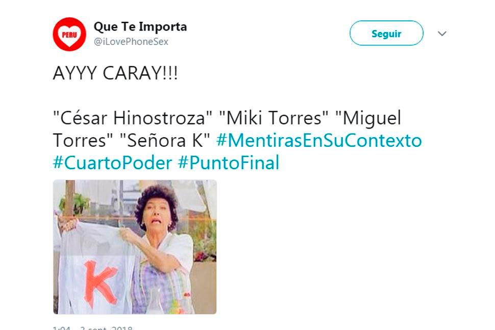 “La ‘señora K’ no era ninguna dama, sino que era el señor Miki Torres. Cuando yo fui, pensé encontrar a alguna dama. Cuando yo fui a la reunión, no había ninguna señora, estaba el señor”, explicó al programa Punto Final.