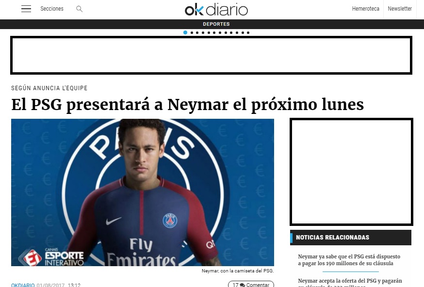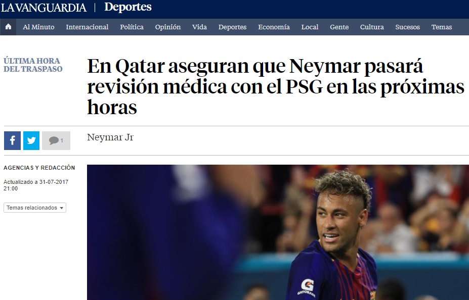 Por otro lado, la web española «20 minutos» asegura que El Barcelona espera que Ney se sume mañana a los entrenamientos con total normalidad tras volver de sus vacaciones luego de disputar la Copa Confederaciones en Rusia.