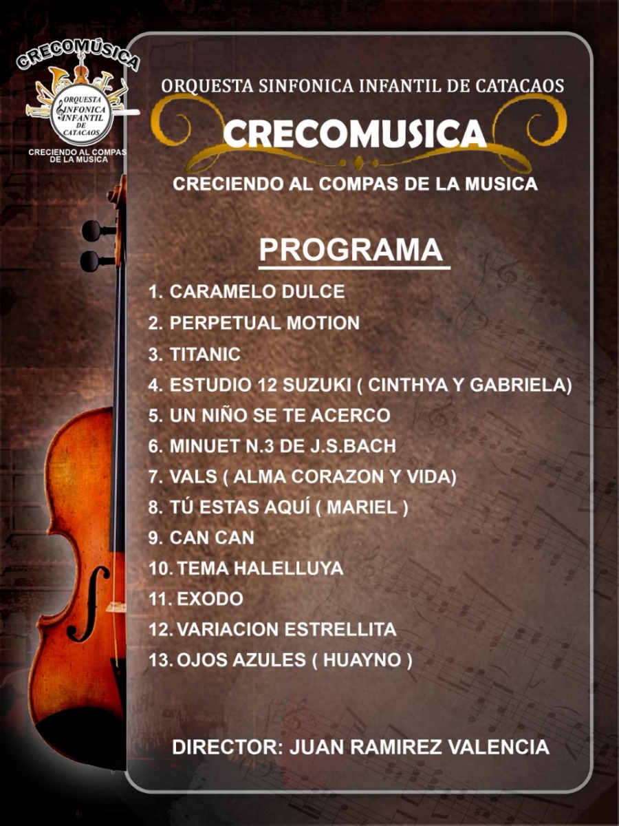 La Orquesta Sinfónica Infantil de Catacaos “Creciendo al Compás de la Música” se presentará este sábado 13 de abril, a las 10 a.m., en la iglesia San Juan Bautista de Catacaos, en la víspera del inicio de la Semana Santa. Ingreso libre.