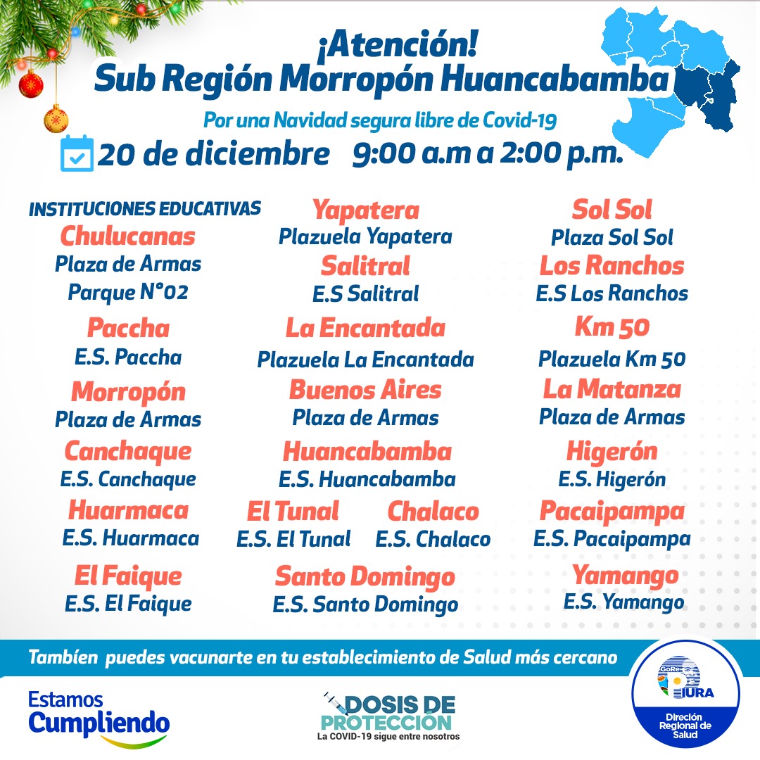 Al respecto, la supervisora de inmunizaciones del Ministerio de Salud, Lic. Gloria Bazalar Oyola detalló que se viene realizando la tercera jornada de vacunación contra la COVID-19 desde este jueves 14 hasta el domingo 17 de diciembre en toda la región Piura. Posteriormente, este miércoles 20 continuará la vacunación.