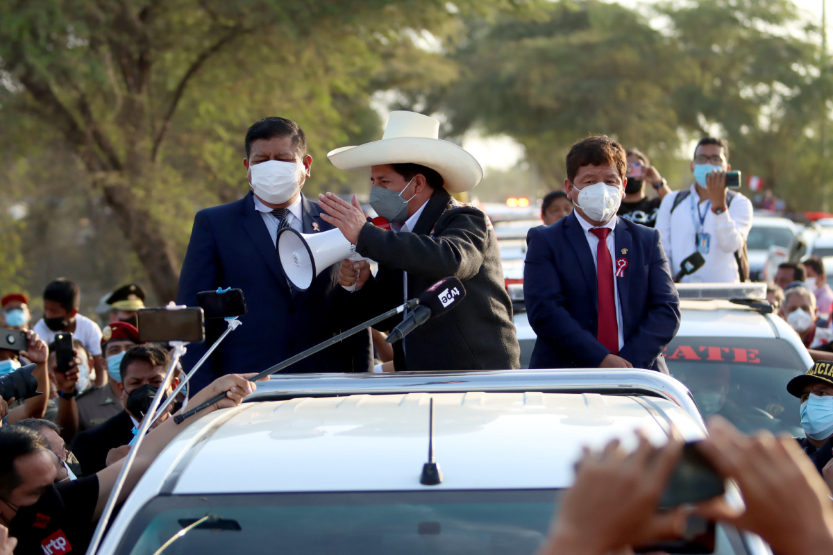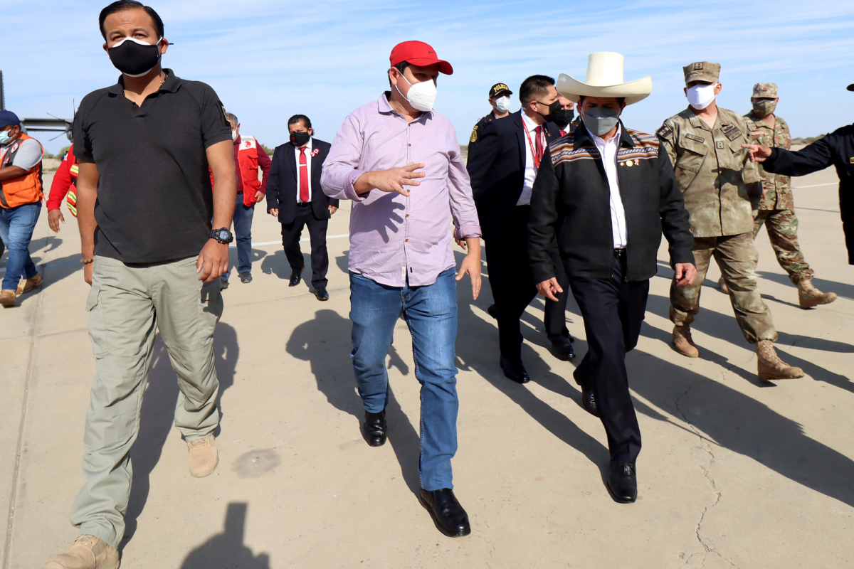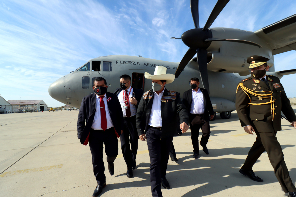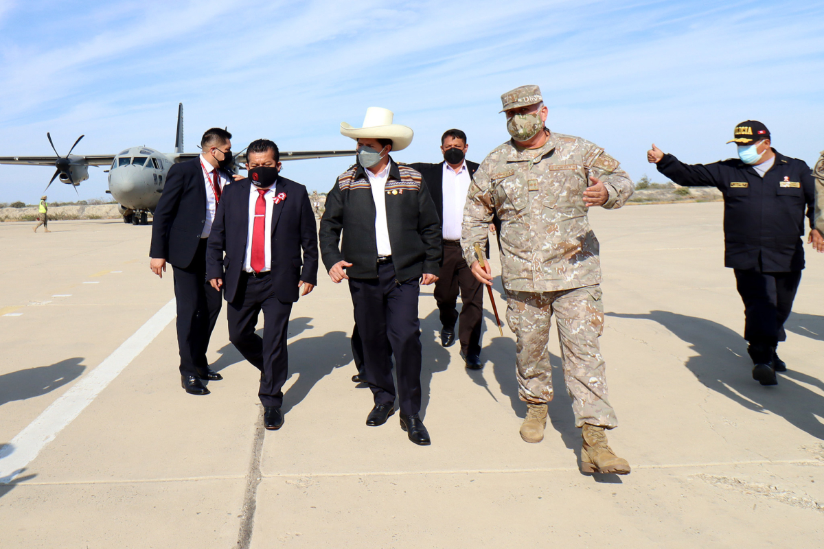 El presidente Castillo llegó esta tarde a Piura en compañía del jefe del Gabinete Ministerial, Guido Bellido, y el ministro de Defensa, Walter Ayala.