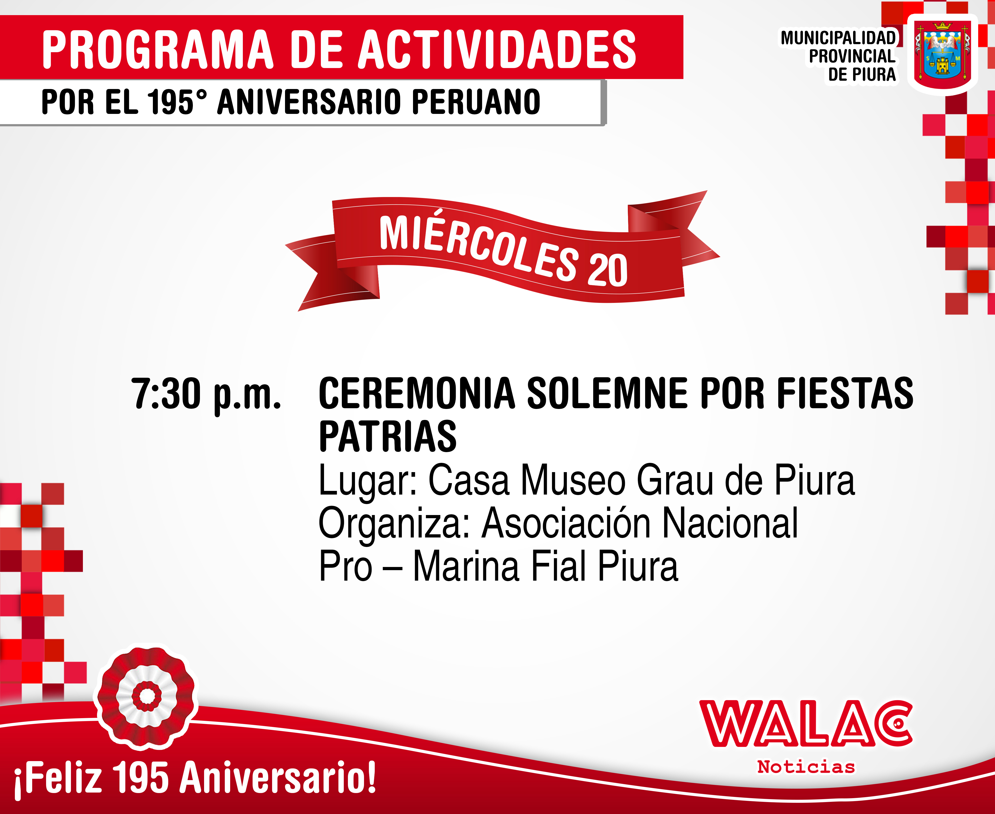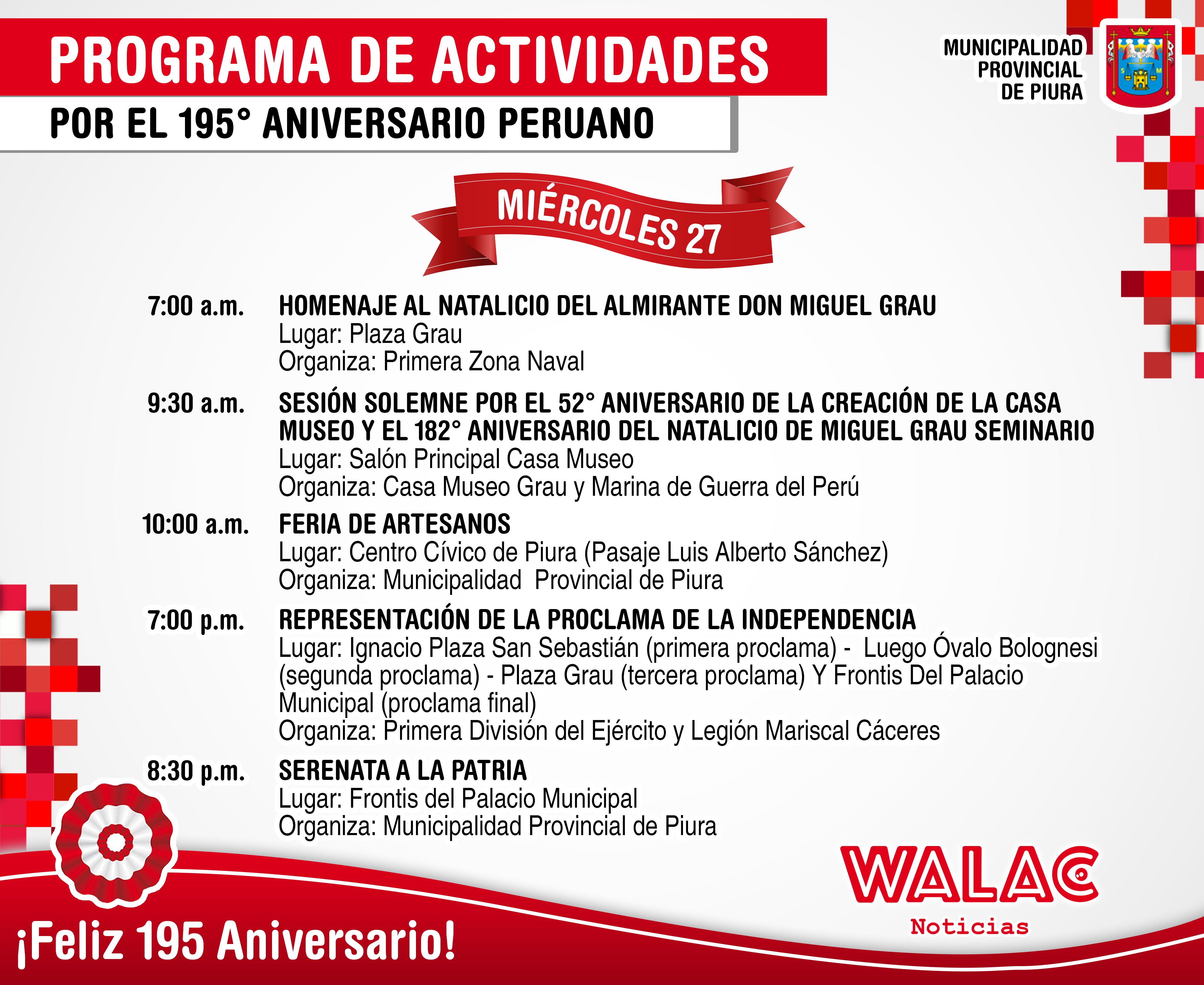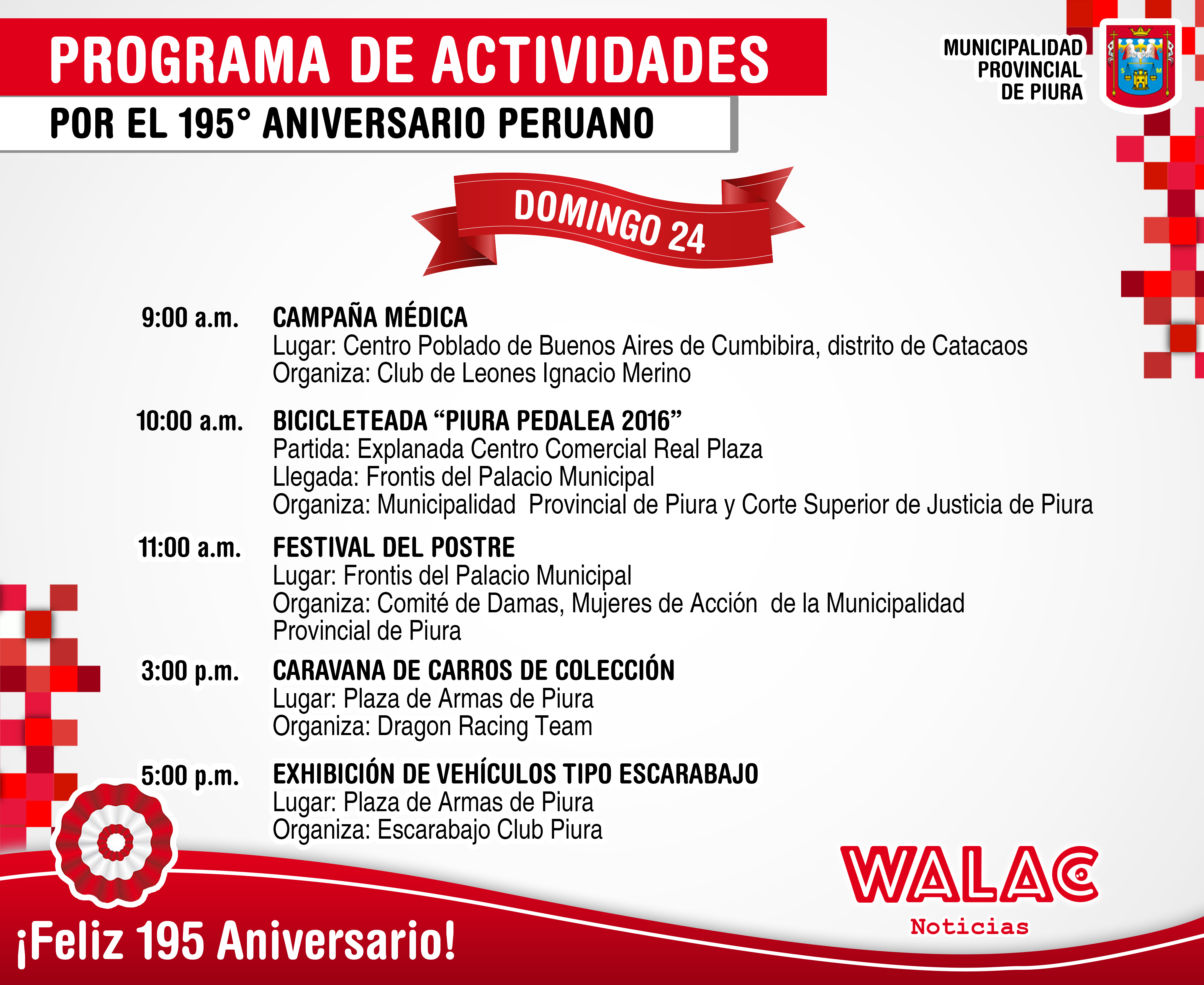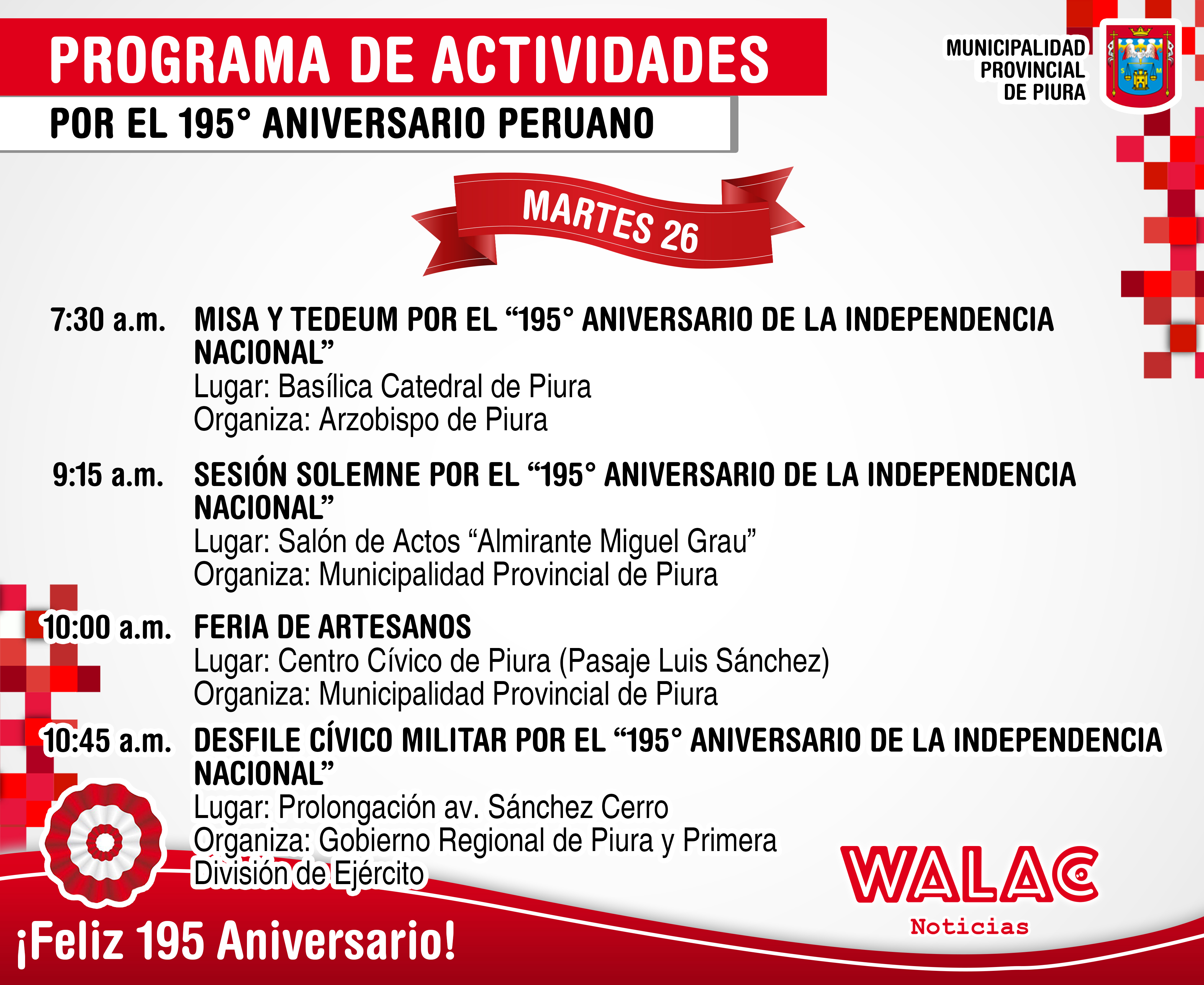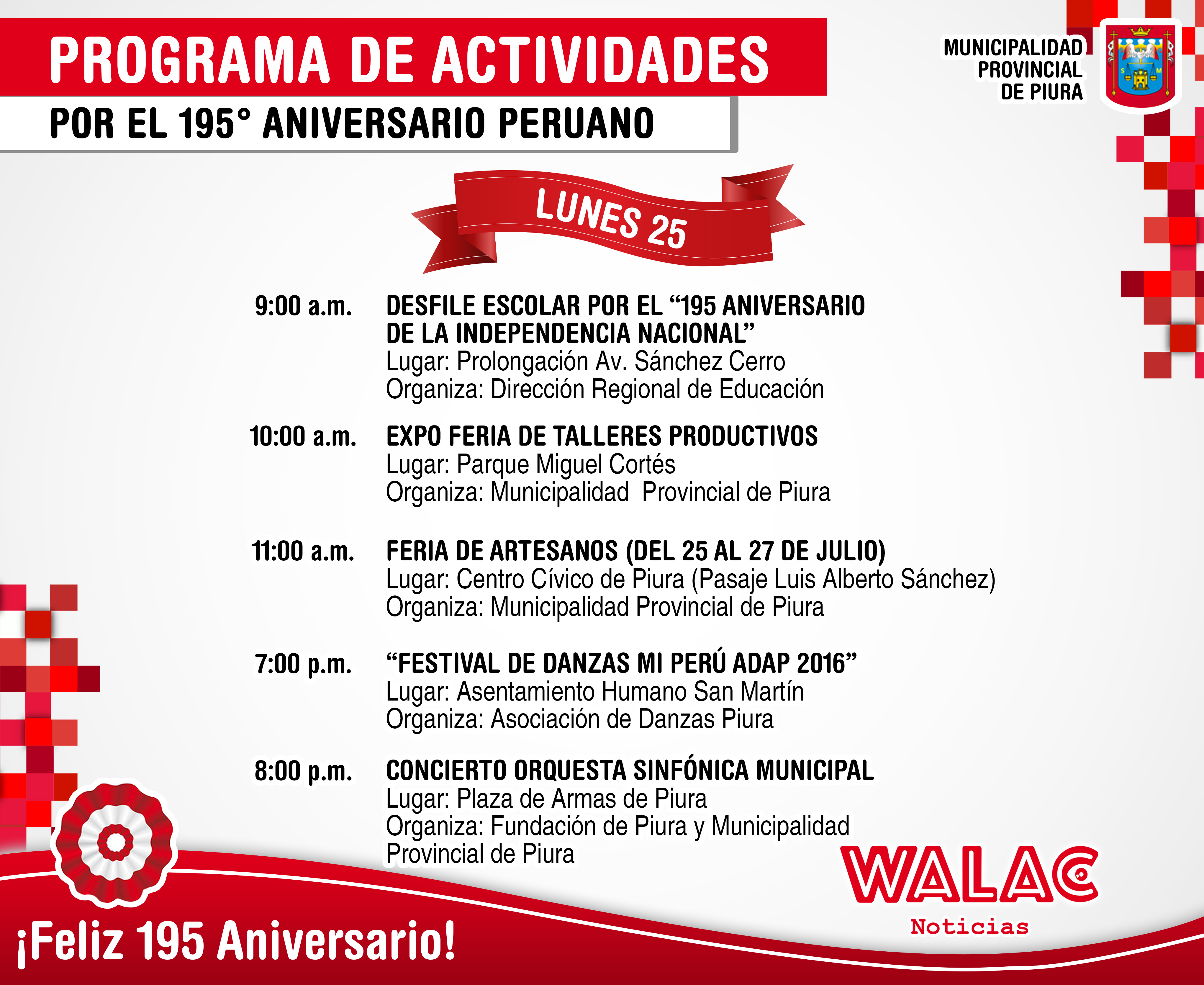 Bajo el slogan «Piura de Rojo y Blanco» la Municipalidad Provincial de Piura ha desarrollado el programa de Fiestas Patrias por el 195 aniversario.