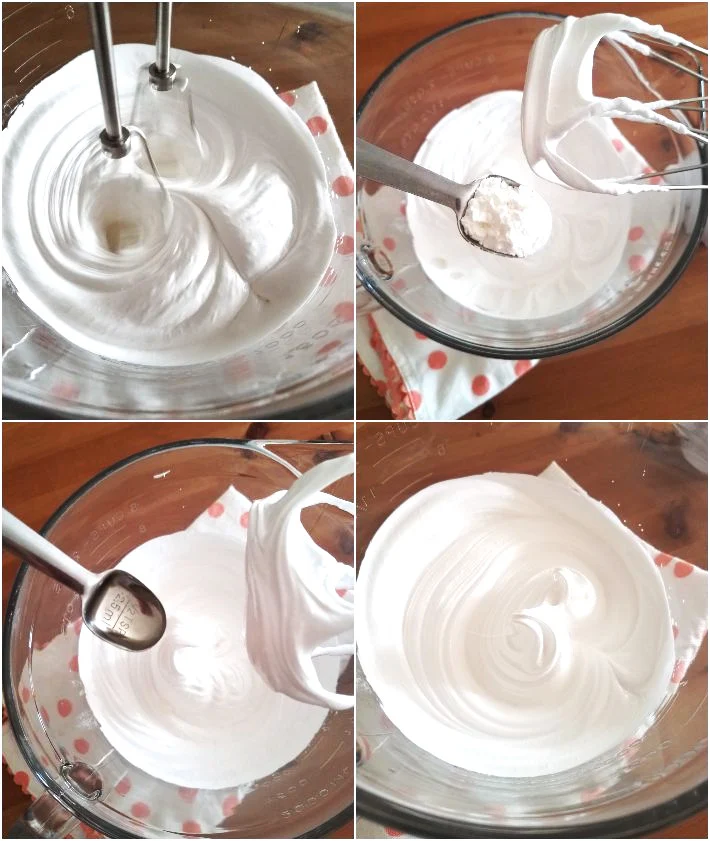 Para preparar los merenguitos caseros, mezcla las claras de huevo a temperatura ambiente con azúcar y una pizca de sal. Luego, precalienta el horno a 90 °C y coloca papel para hornear en dos bandejas. Después, lleva las claras al baño María junto con el azúcar y la sal; remueve de forma constante hasta que los granos de azúcar desaparezcan al tacto. Cuando la mezcla esté tibia y homogénea, bátela a velocidad alta hasta obtener picos firmes. En ese momento añade el cremor tártaro o el vinagre, la maicena y la esencia que prefieras para integrar todo.