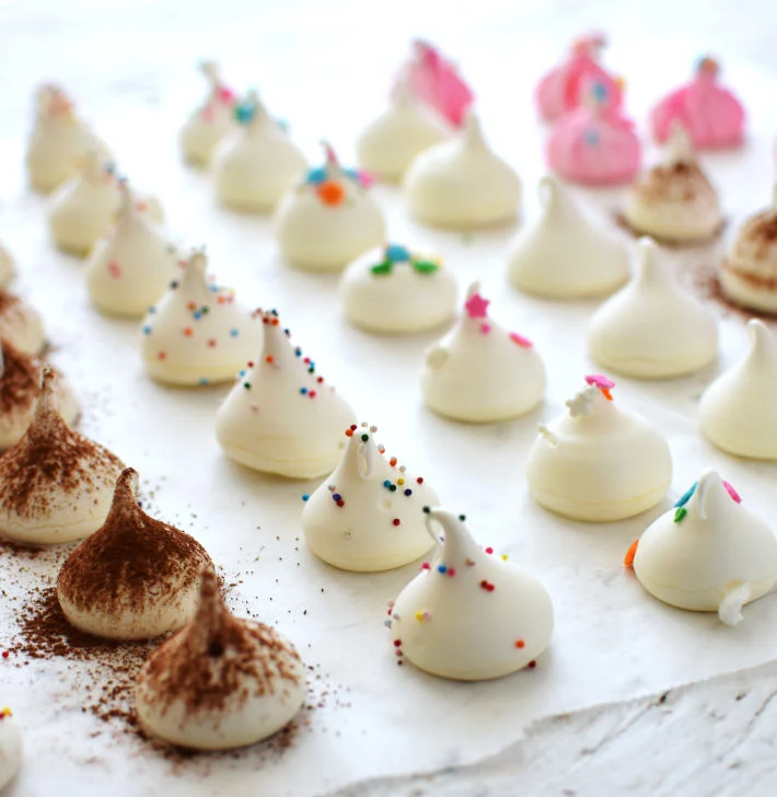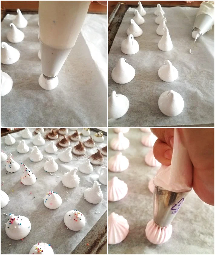 A continuación, usa una manga pastelera con boquilla rizada o lisa y forma los merenguitos sobre la bandeja. También puedes agregar lluvia de colores, almendras, cacao o coco rallado, según el estilo que prefieras. Después, hornea la preparación durante aproximadamente 1 hora y 20 minutos y rota las bandejas para obtener un secado más parejo. Finalmente, apaga el horno y deja los merenguitos dentro hasta que se enfríen por completo, lo que ayuda a evitar quiebres.
