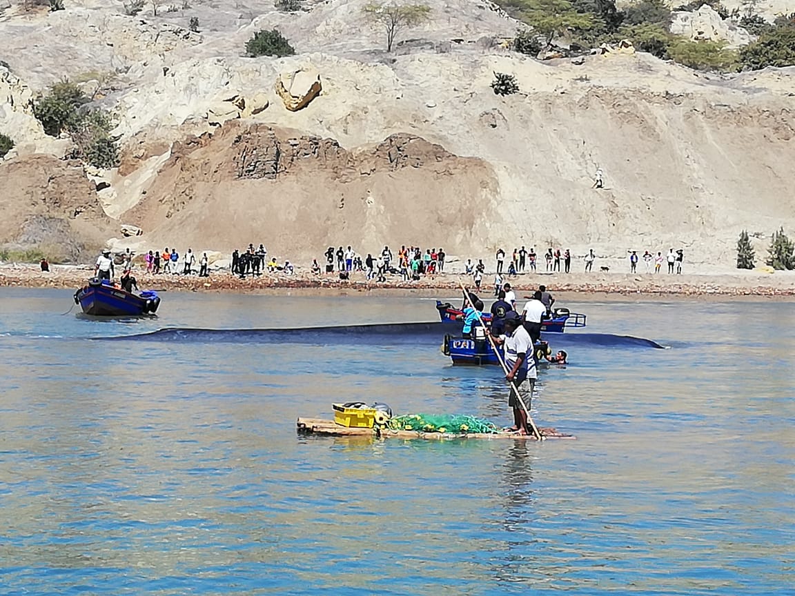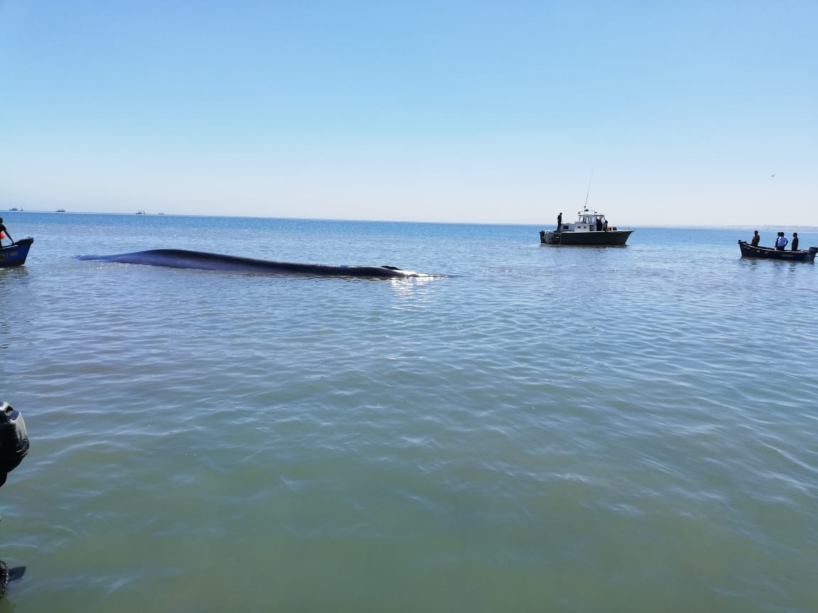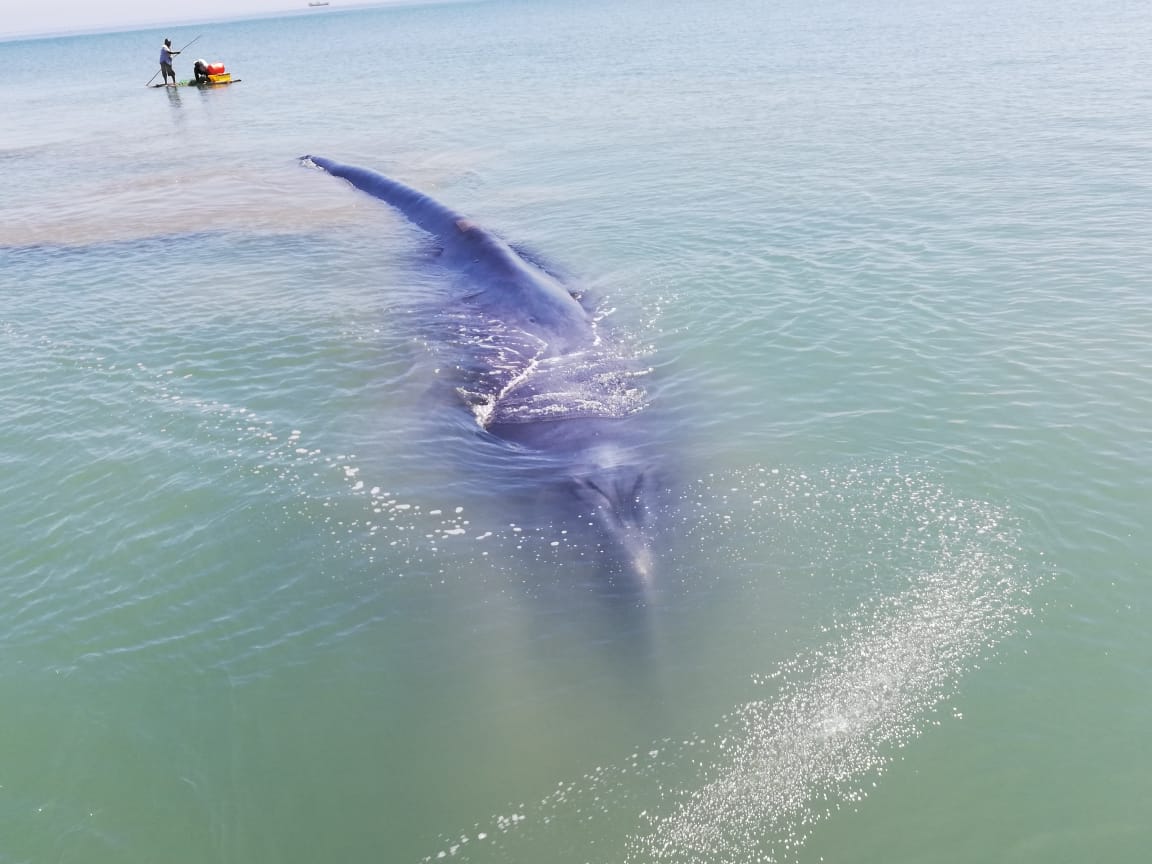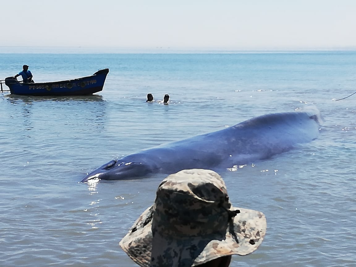 Tras una coordinación con personal de Imarpe, personal de Recursos Naturales de la Municipalidad Provincial de Paita por vía terrestre y 5 chalanas de pescadores realizaron maniobras para desplazar a la ballena.