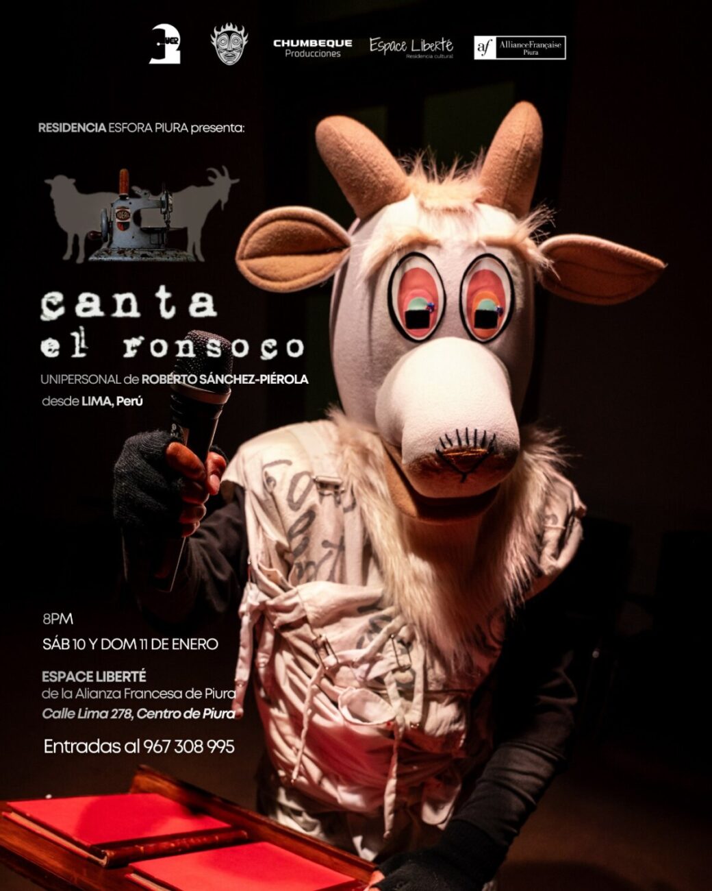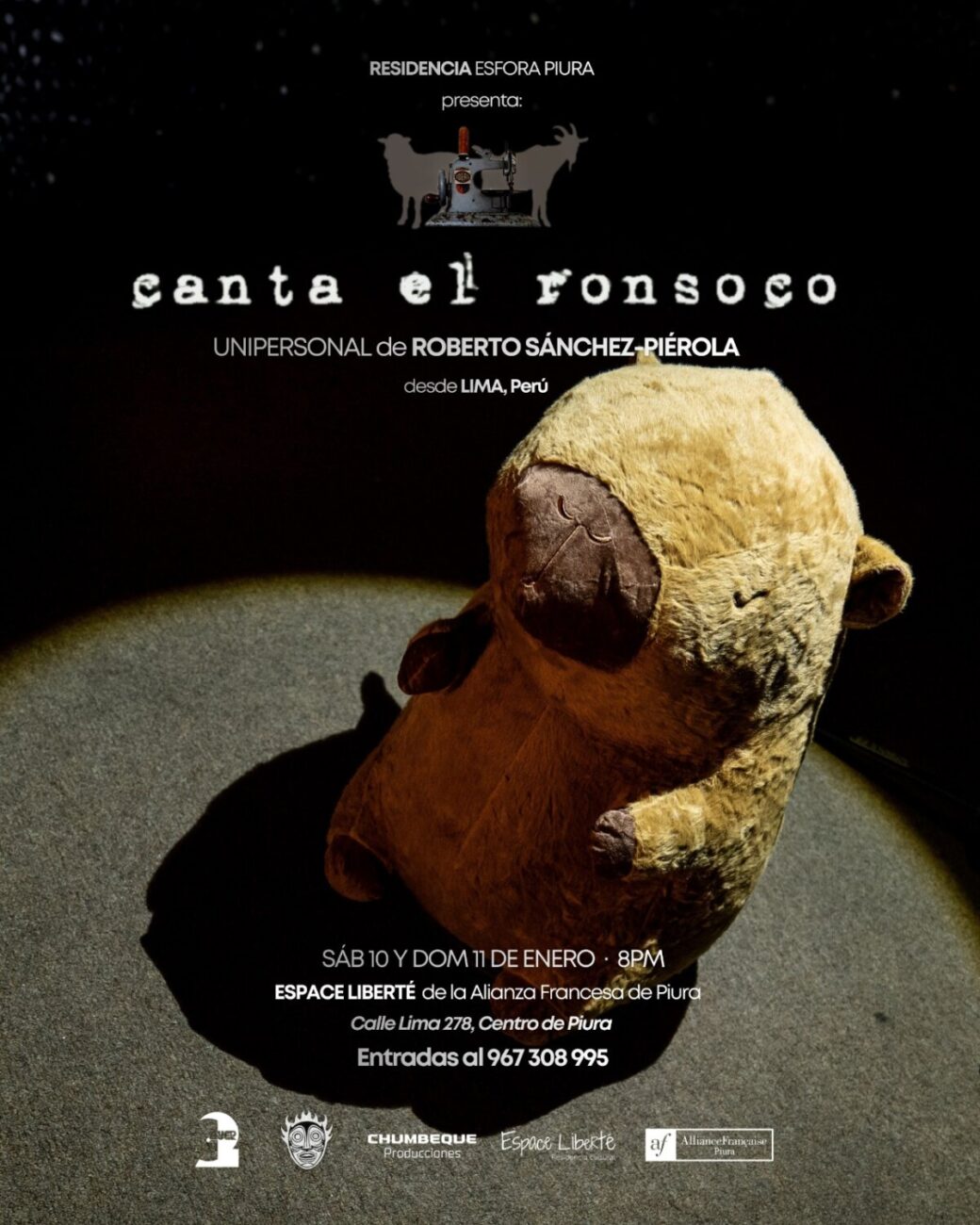 Como cierre del seminario, Roberto Sánchez-Piérola presentará por primera vez en Piura su unipersonal Canta el ronsoco, una propuesta de teatro de objetos y títeres que explora nuevas formas de relación entre el actor y el espectador. Las funciones se realizarán el sábado 10 y domingo 11 de enero en Espace Liberté, residencia cultural de la Alianza Francesa de Piura, ubicada en la calle Lima 278, en el centro de la ciudad.