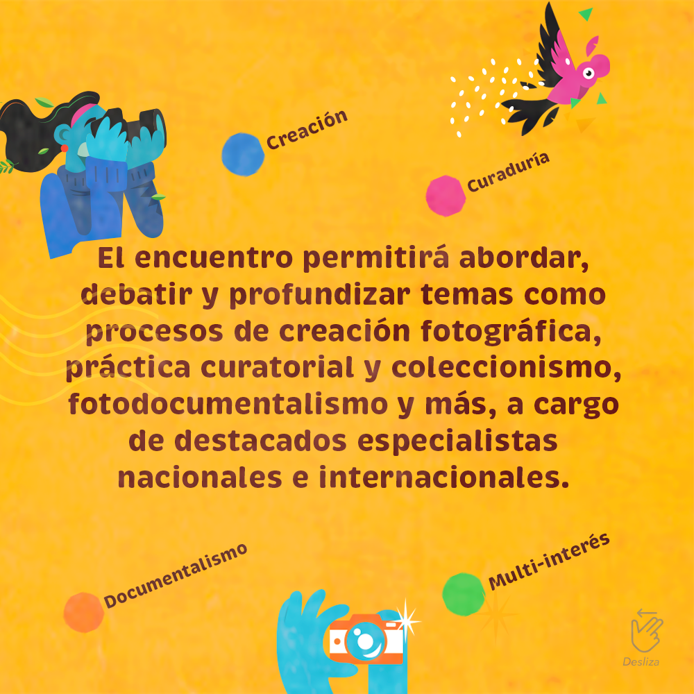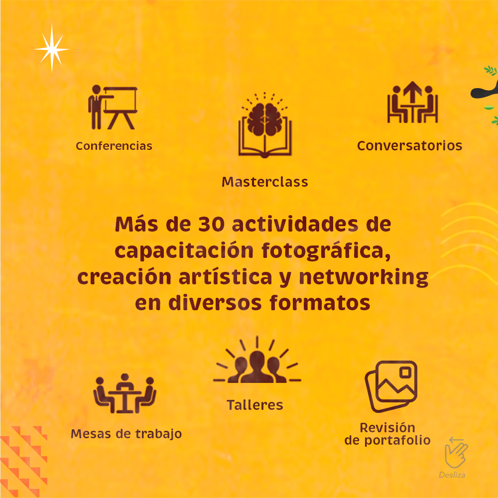 Para una mejor aproximación al encuentro se han planteado tres grandes rutas temáticas. La ruta “Creación” ofrece un conjunto de experiencias para potenciar y enriquecer los procesos de producción fotográfica. La ruta “Fotoperiodismo / documentalismo” aborda tanto los aspectos relacionados al ejercicio fotográfico como al planteamiento de proyectos y formas de financiamiento. Y la ruta “Curaduría y coleccionismo” busca ampliar el entendimiento de los participantes sobre el circuito del arte y la cultura relacionado a esos campos.
